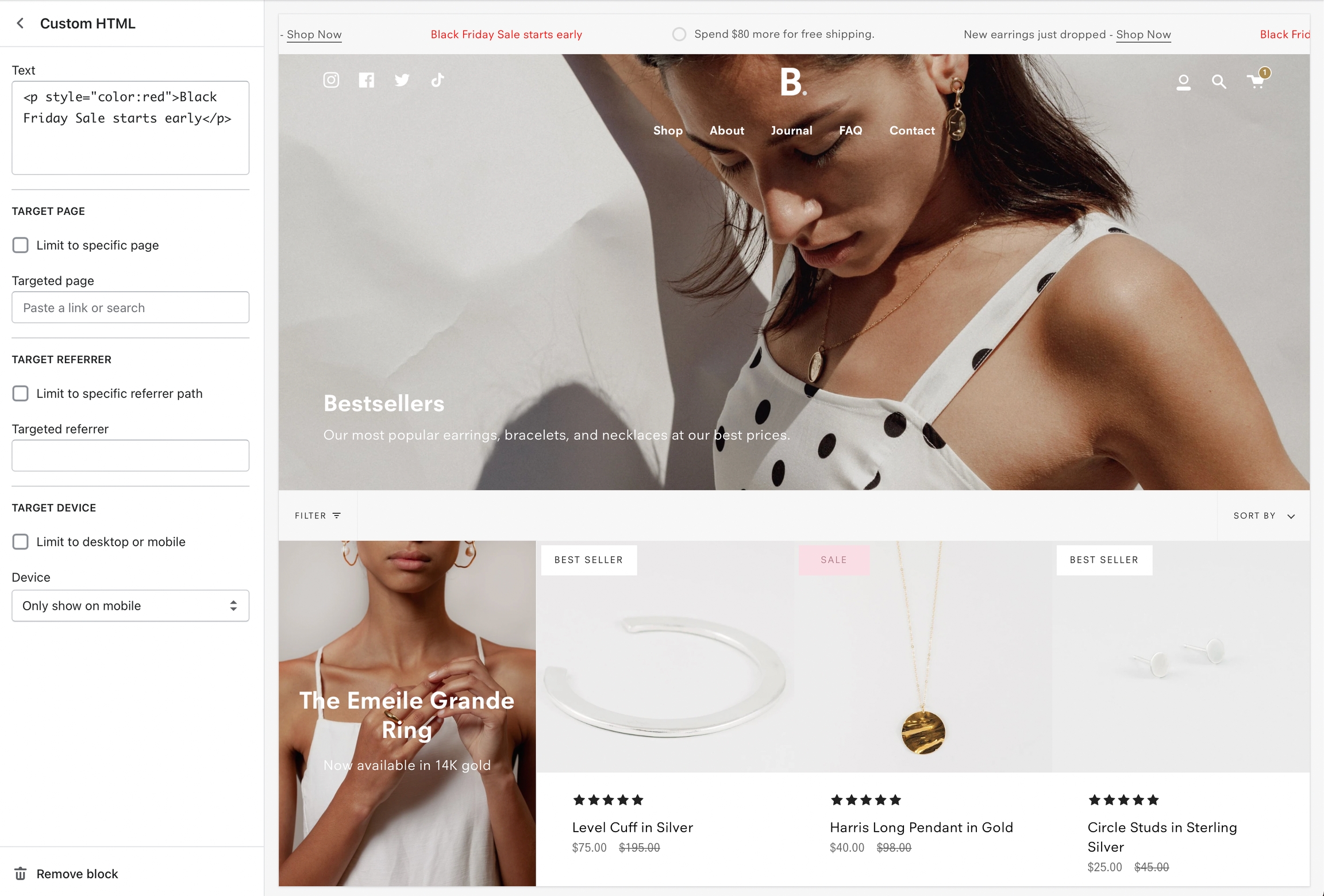 Display custom announcement messages to your customers only when the customer is browsing a certain page, product, collection, or blog post on your site. Target your message based on where customers are browsing on your site: