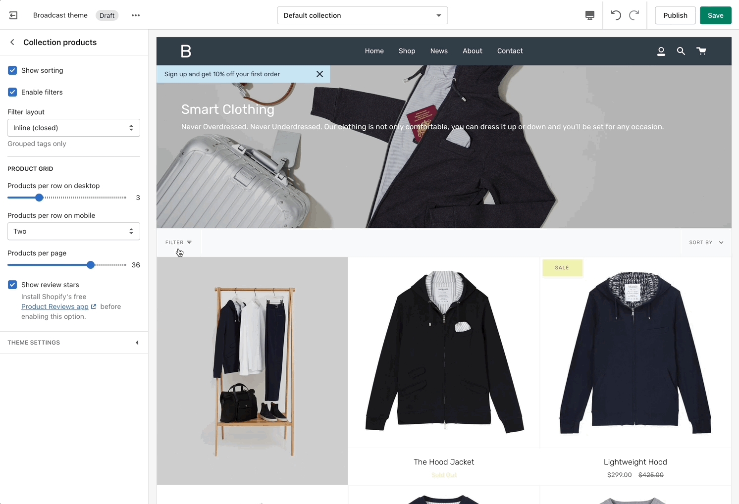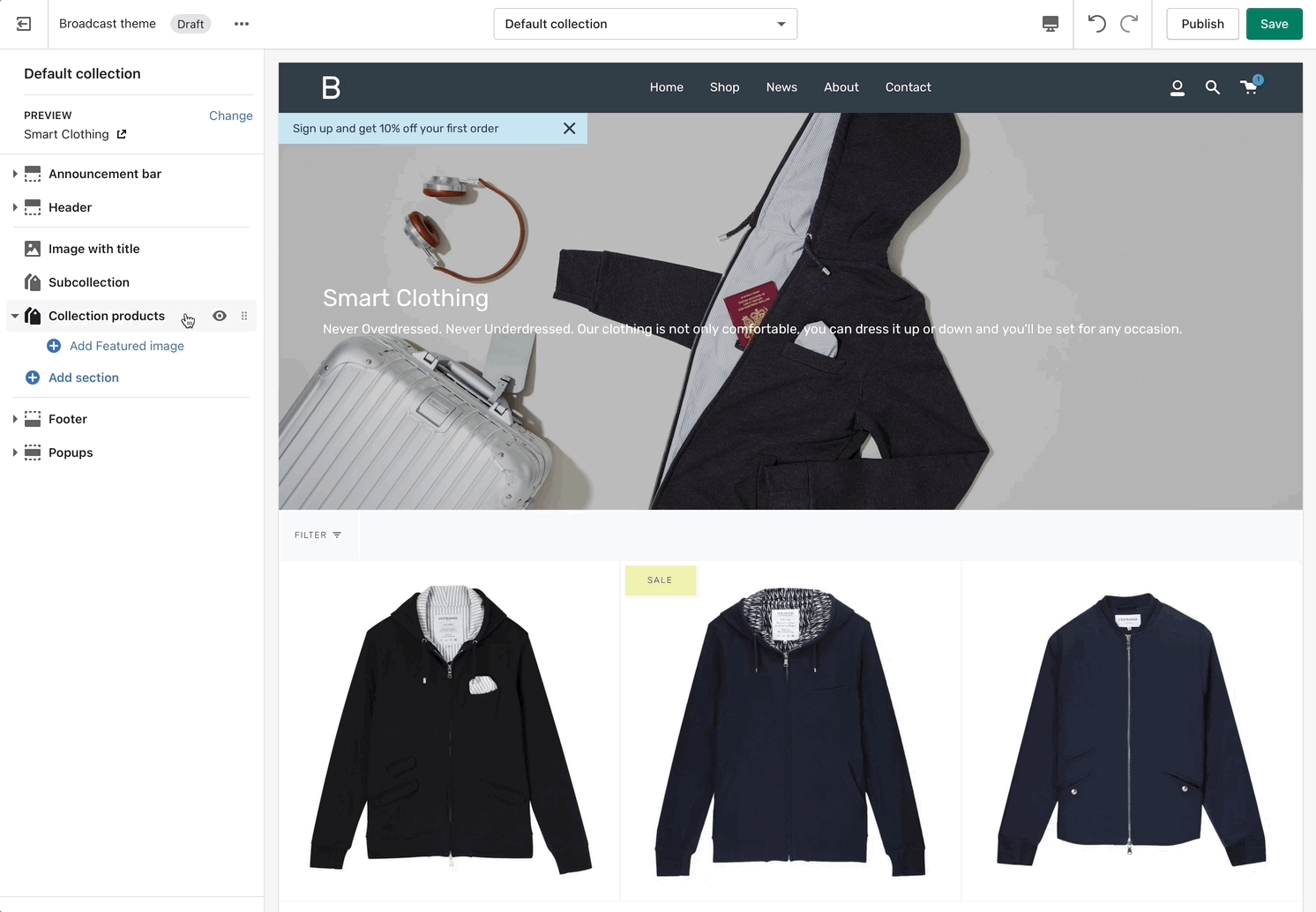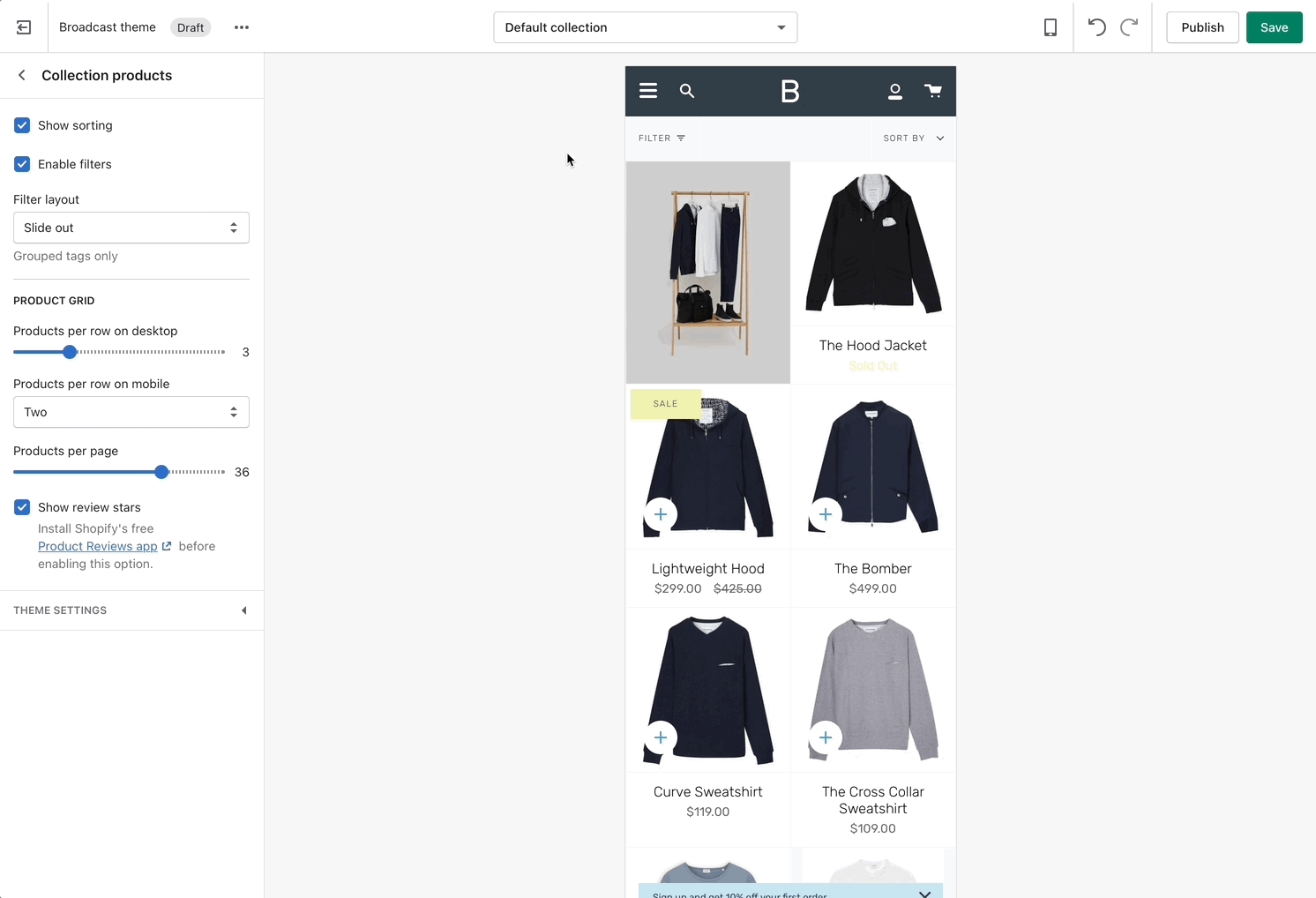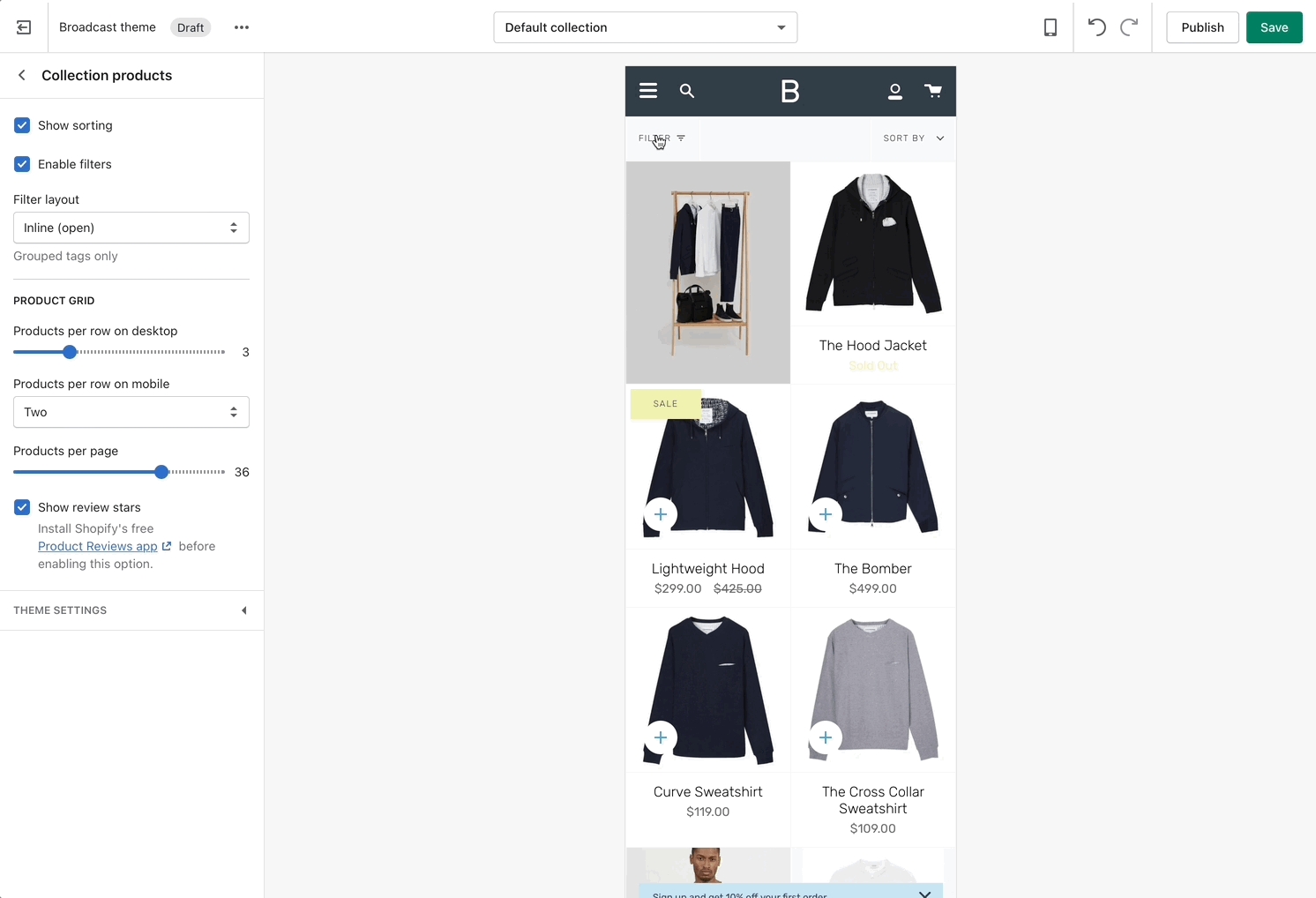 Setup with Broadcast is fast and simple. Using the Theme Editor, navigate to any collection page (or choose the default collection template) and click on Collection products to view the settings: