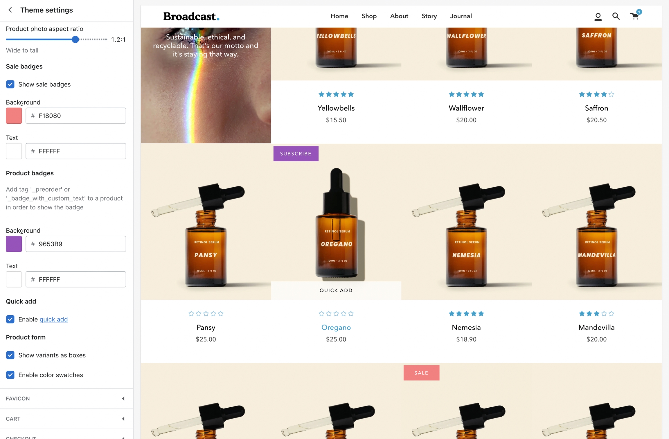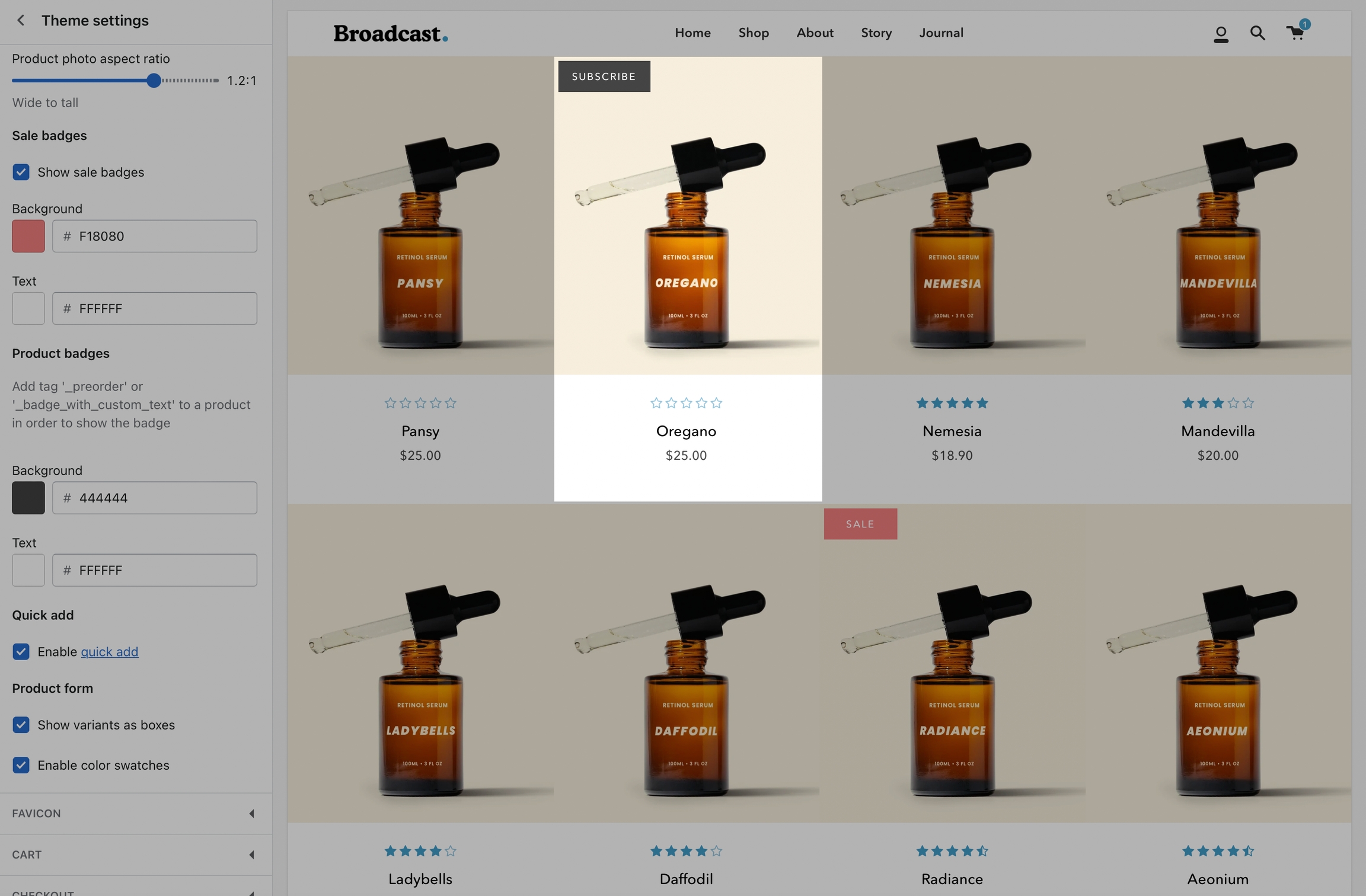 Use the Broadcast theme settings to modify the background and foreground colors for Sale badges and Custom product badges: