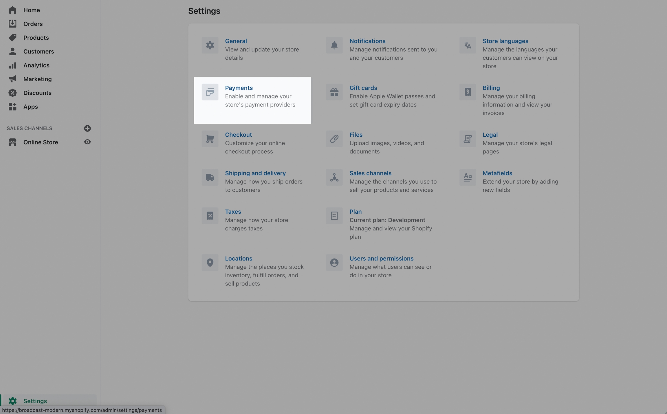 Broadcast supports Shopify's currency selector. Configure using Payments in your Shopify Admin Settings. Choose Manage payments.