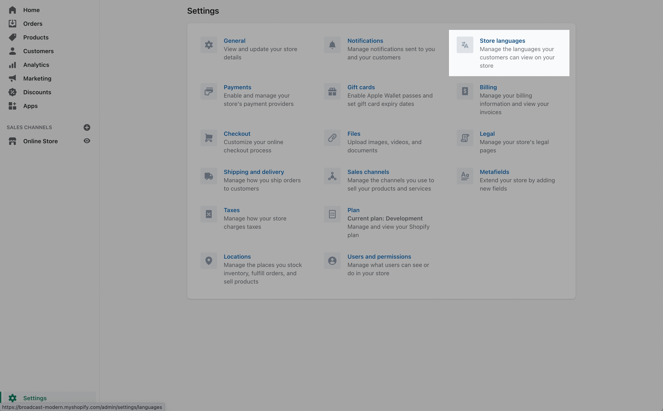 Broadcast support's Shopify's language selector. Configure using Store languages in your Shopify Admin Settings: