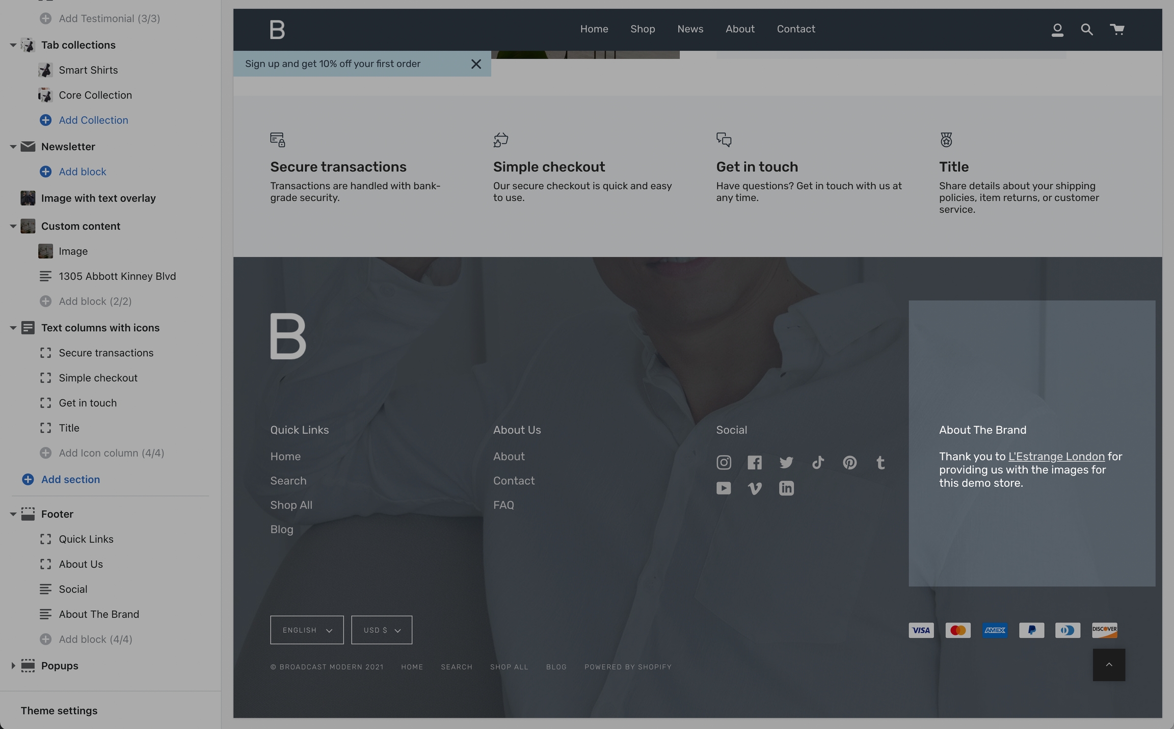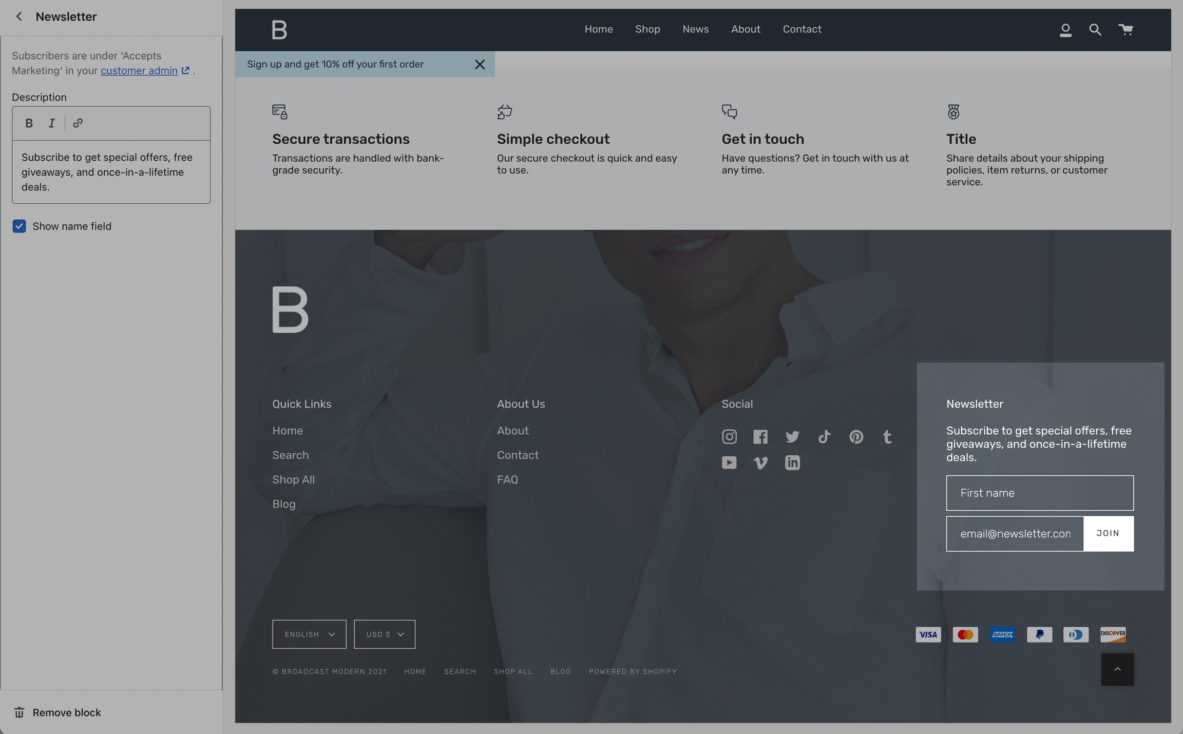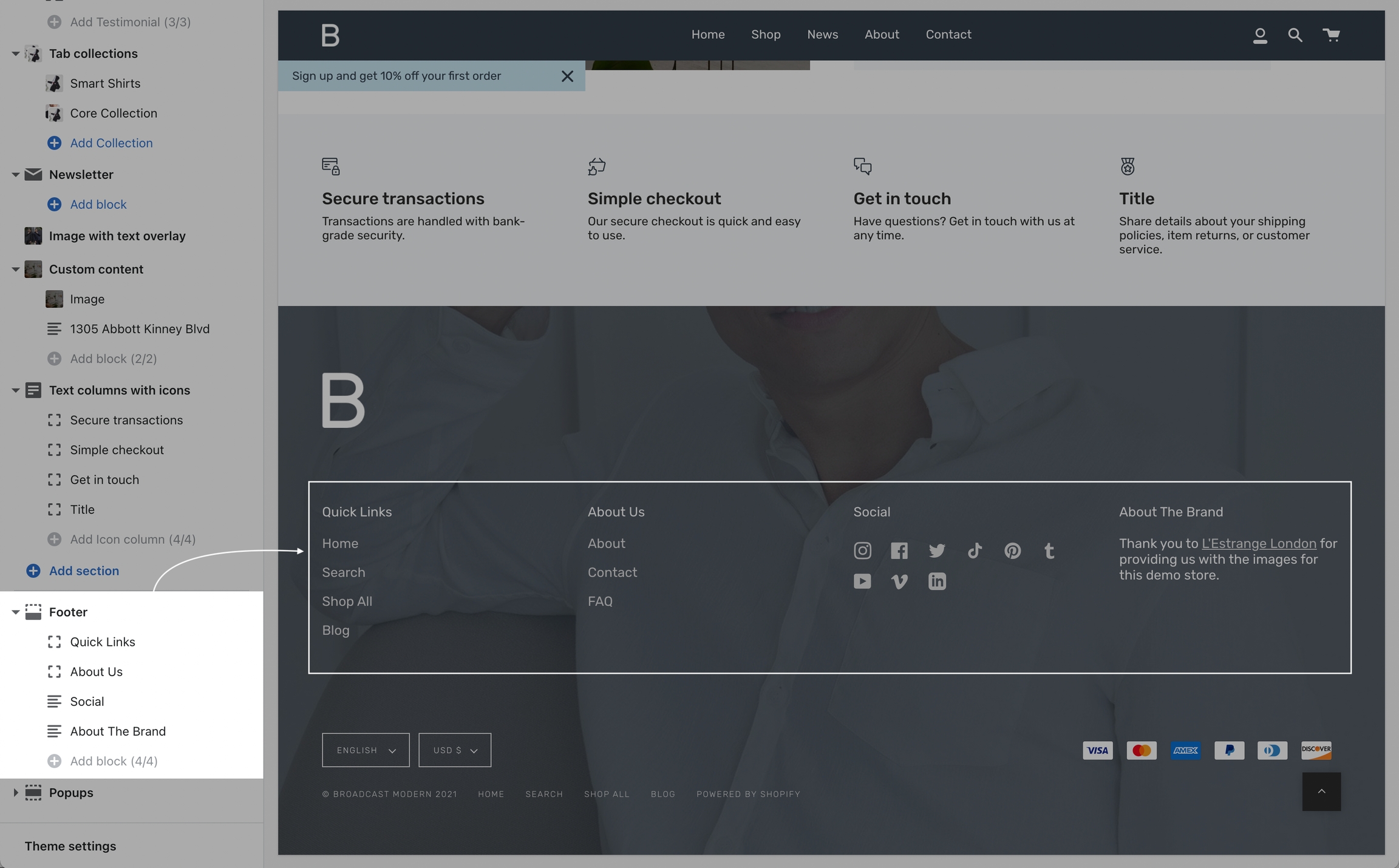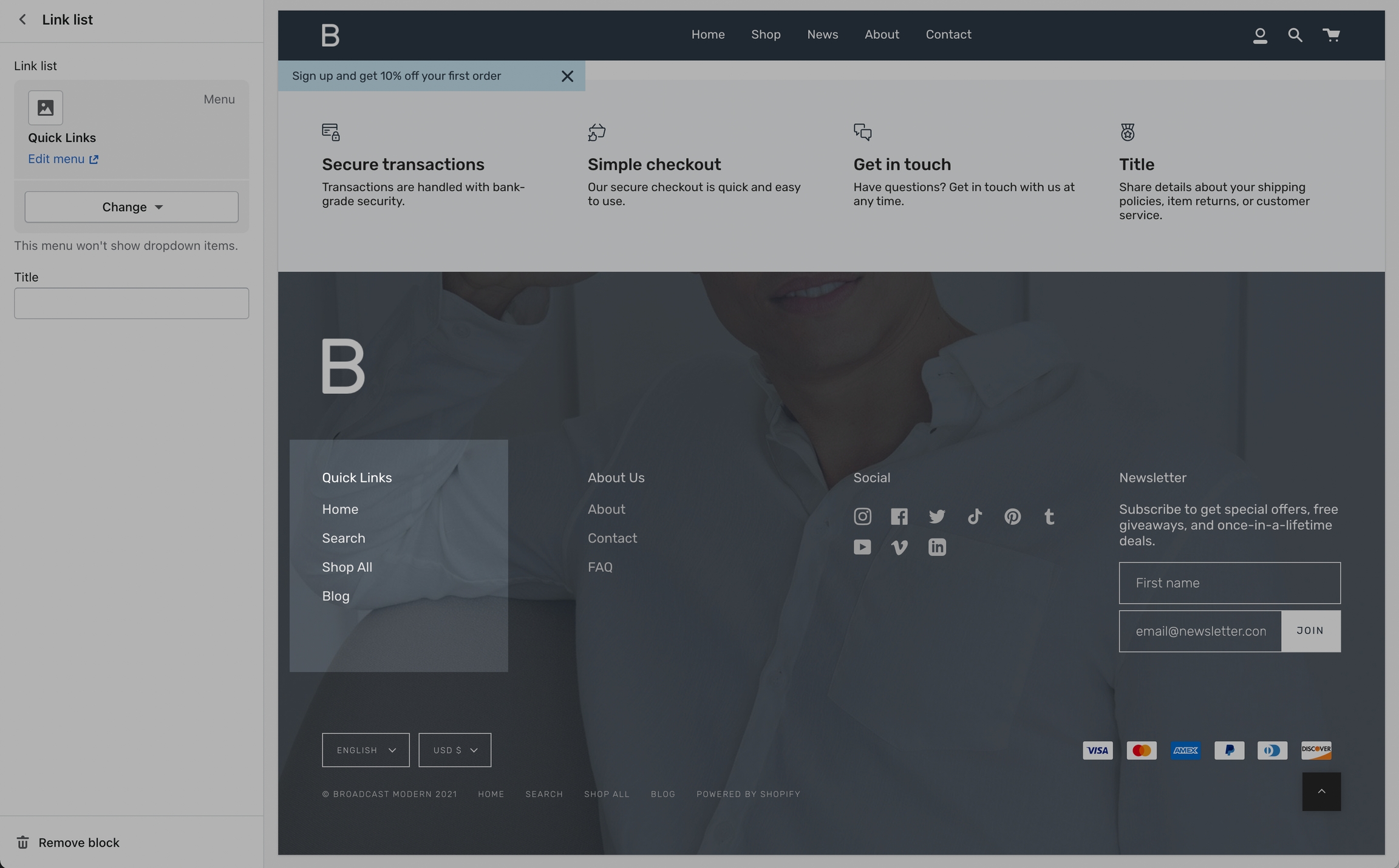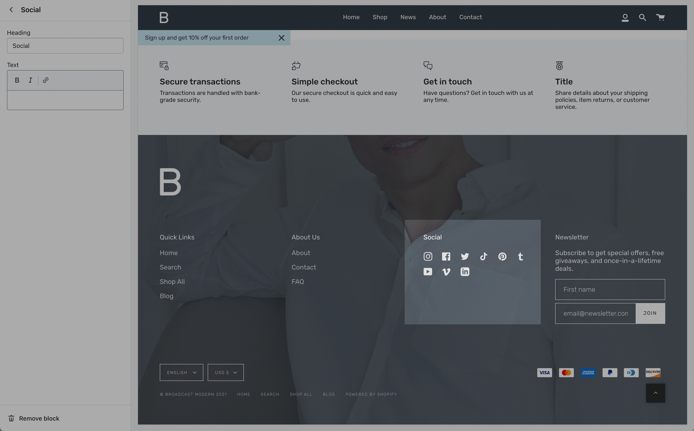 Broadcast footer theme blocks help you customize content columns within the footer: