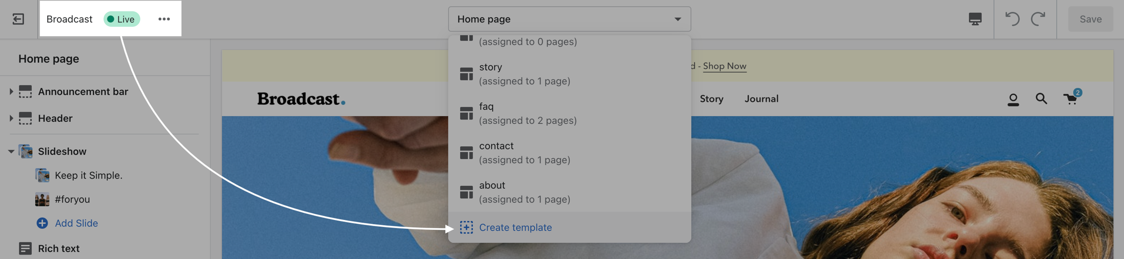 🚨 When creating a new Page template or any type of new template with Shopify Online Store 2.0, you must create the template while customizing your Live published theme.
