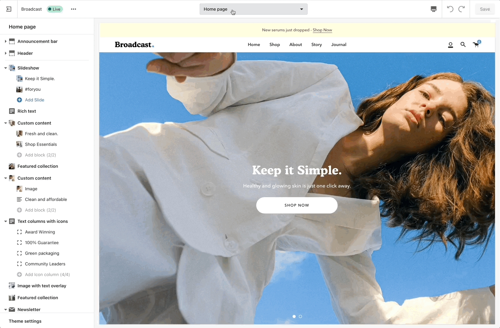 Configure the page settings and sections.