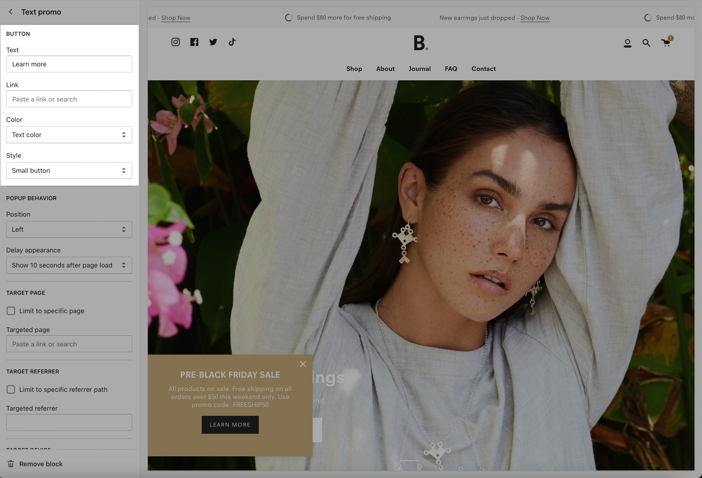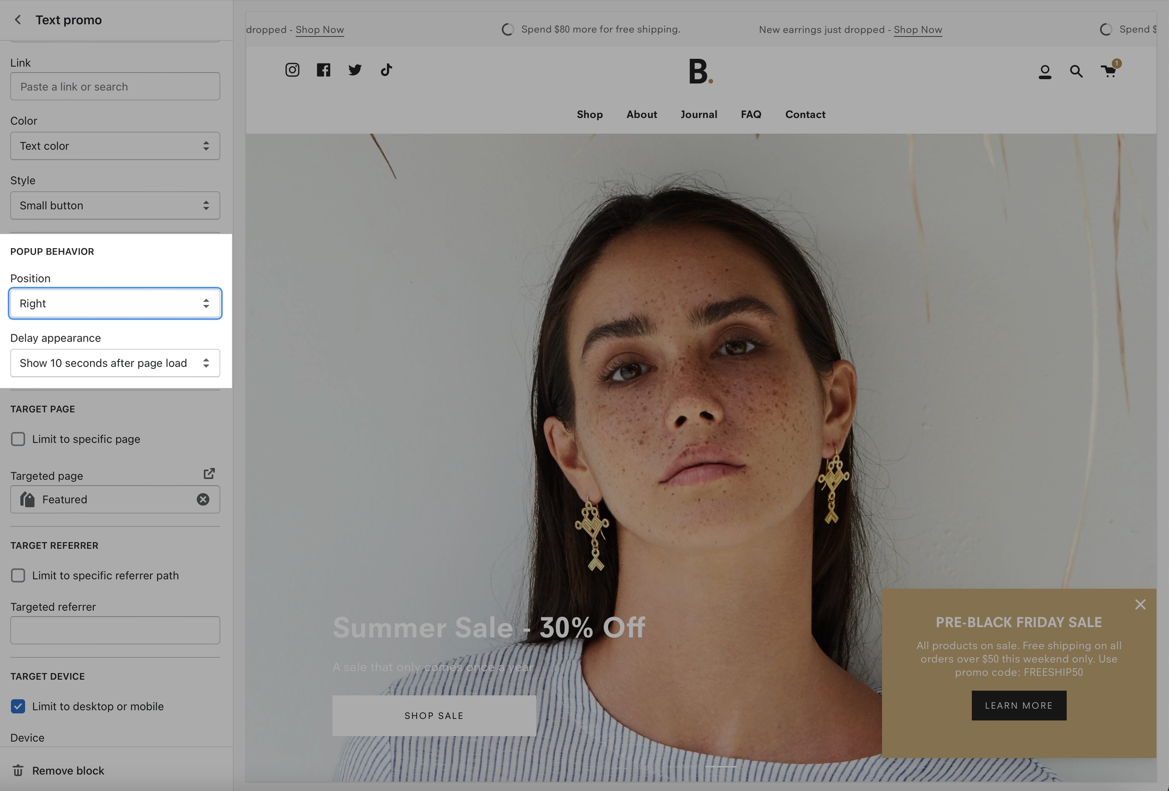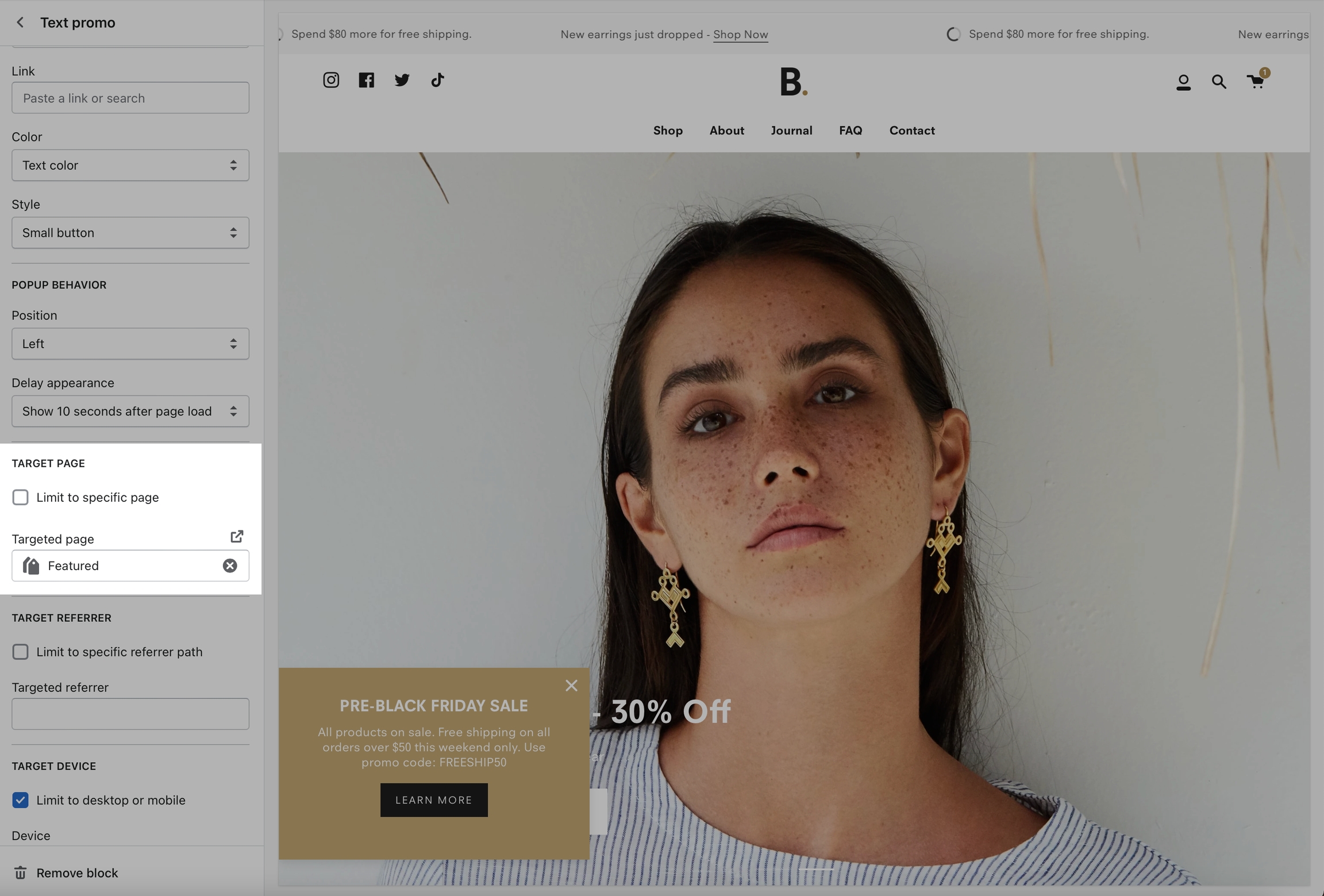 Target a specific audience by using Target Referrer. Your popup will only appear when the customer arrives at your site from a certain path or location.