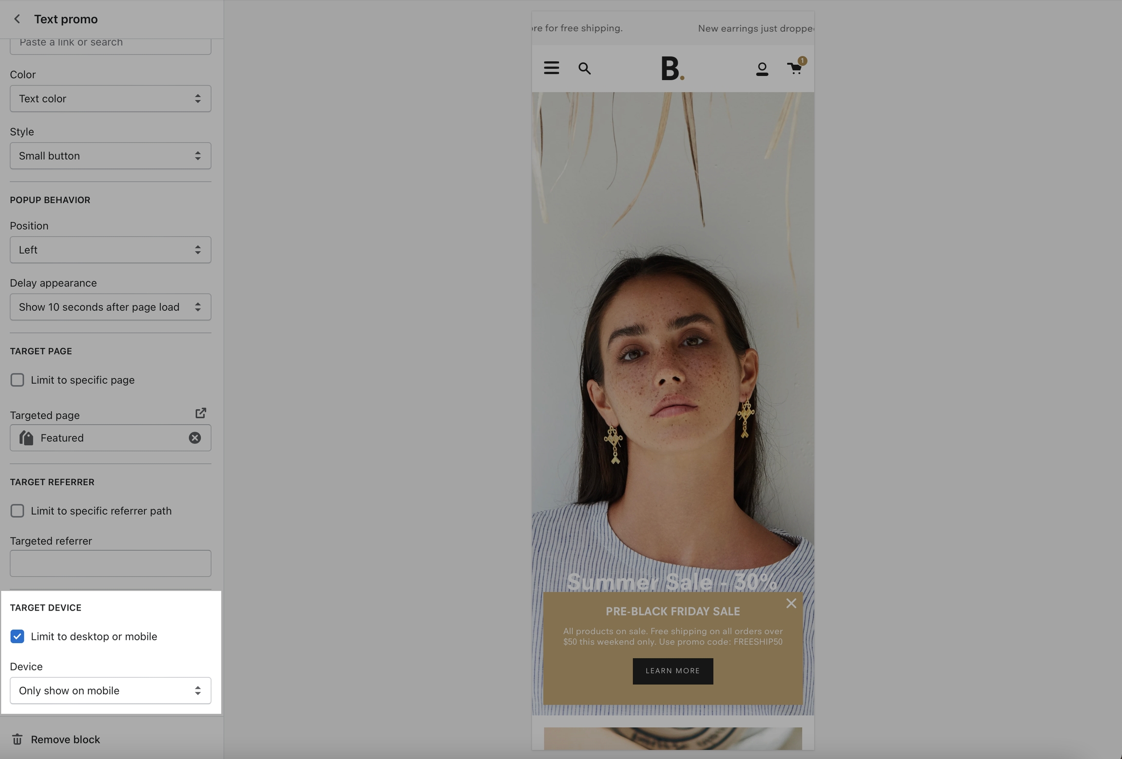 Create a custom popup for mobile devices and another popup for desktop browsers with Target Device. Each popup can be customized with different assets and messaging.