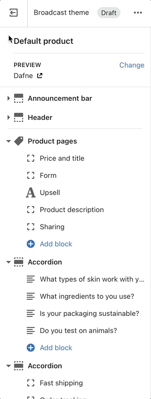 Product description tabs in Broadcast support Shopify's Dynamic source feature with Online Store 2.0. Metafields allow you to attach custom content to each product and then display them on the product page.