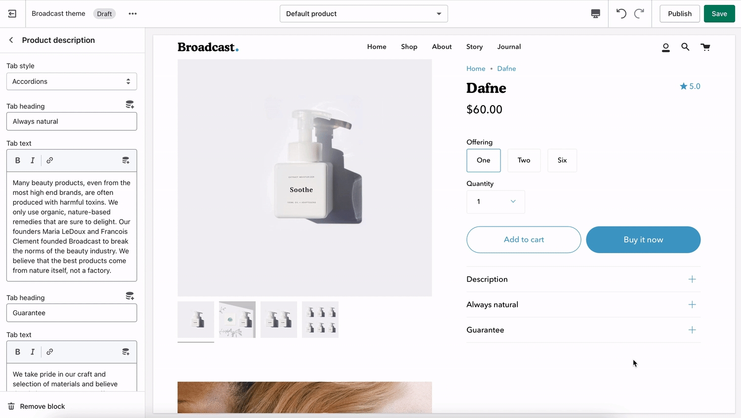 Broadcast can show your product description in tabbed or accordion format. Add extra content to your product pages to help improve customer confidence with your products and brand.