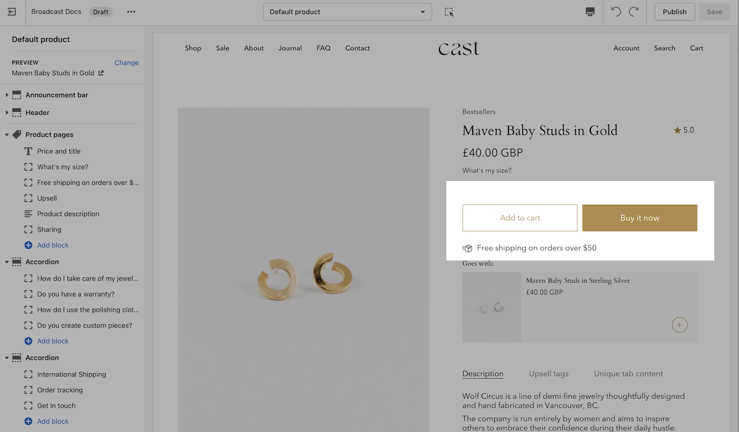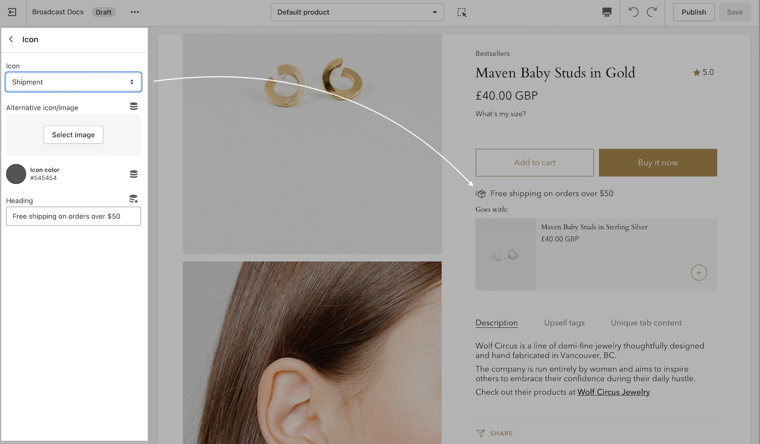 Broadcast includes a Product detail block called Icon that can be added to the Product form on any of your product templates. The block can be positioned in various locations on the form and has easy-to-use block settings to quickly choose a predefined icon and color choice or upload your own custom icon.
