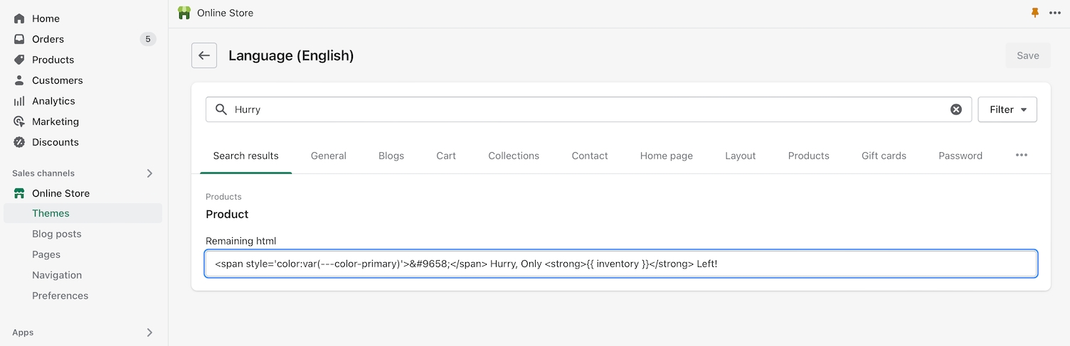 Here you can customize the message. Use the key code {{ inventory }} to display the counter value.
