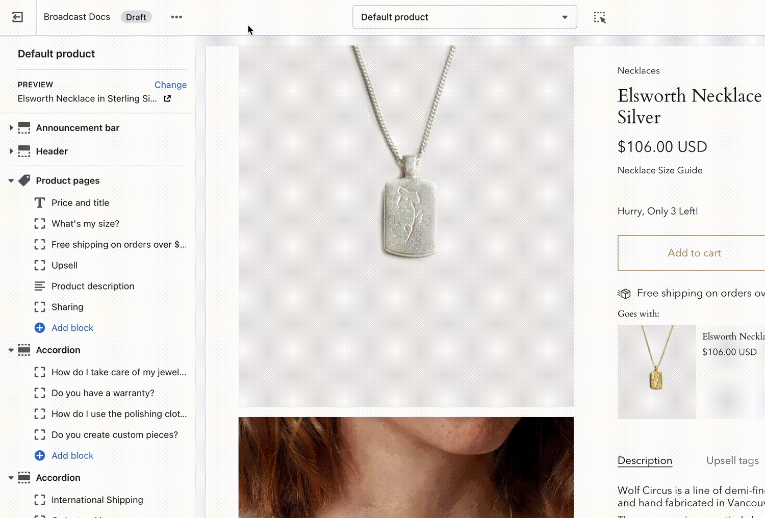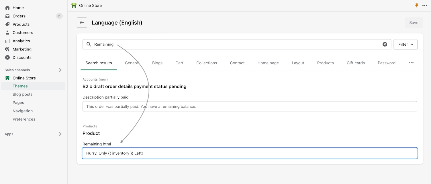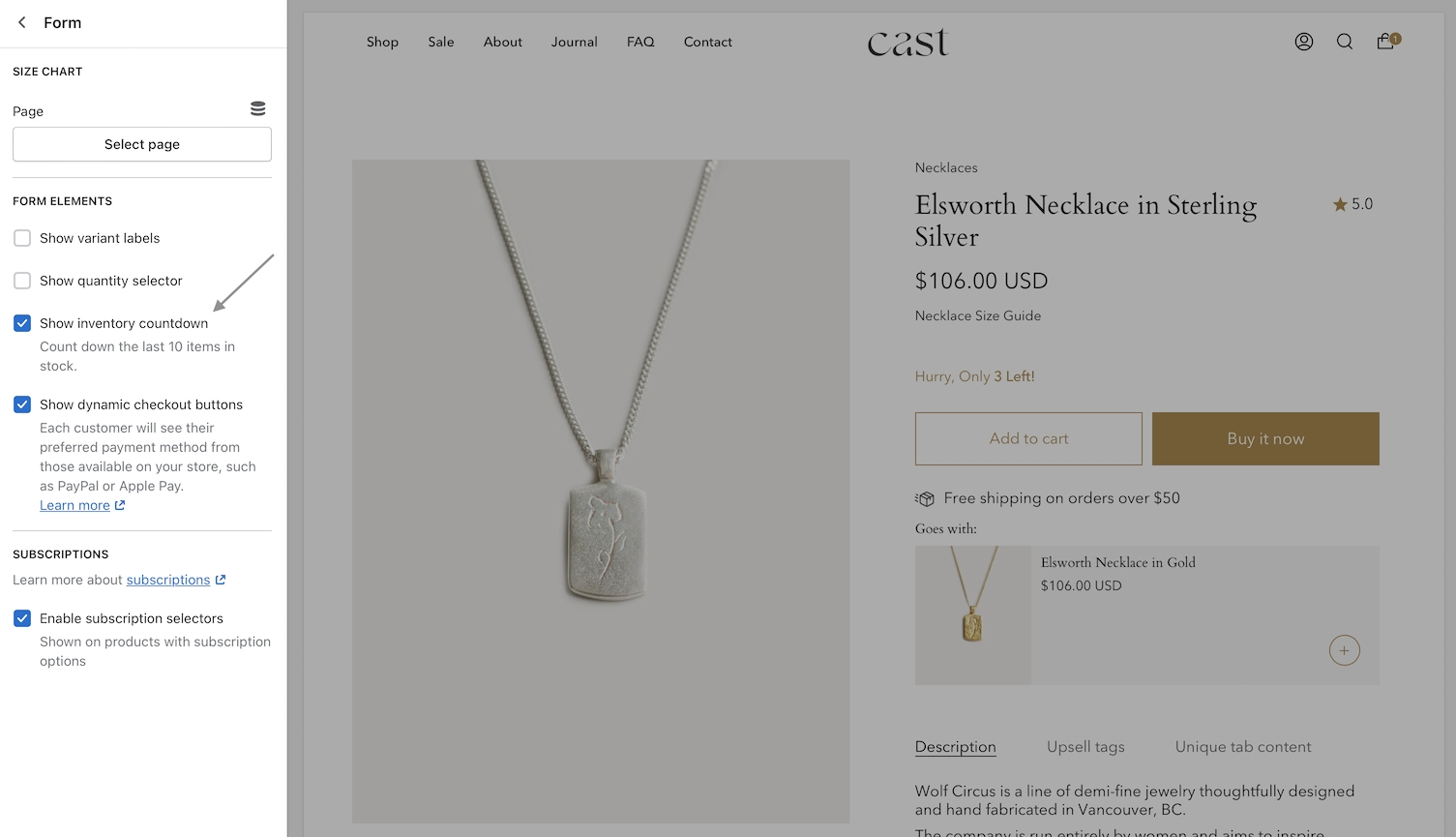 In the Theme Editor, click on the Product form block for the settings options. Toggle on Show inventory countdown: