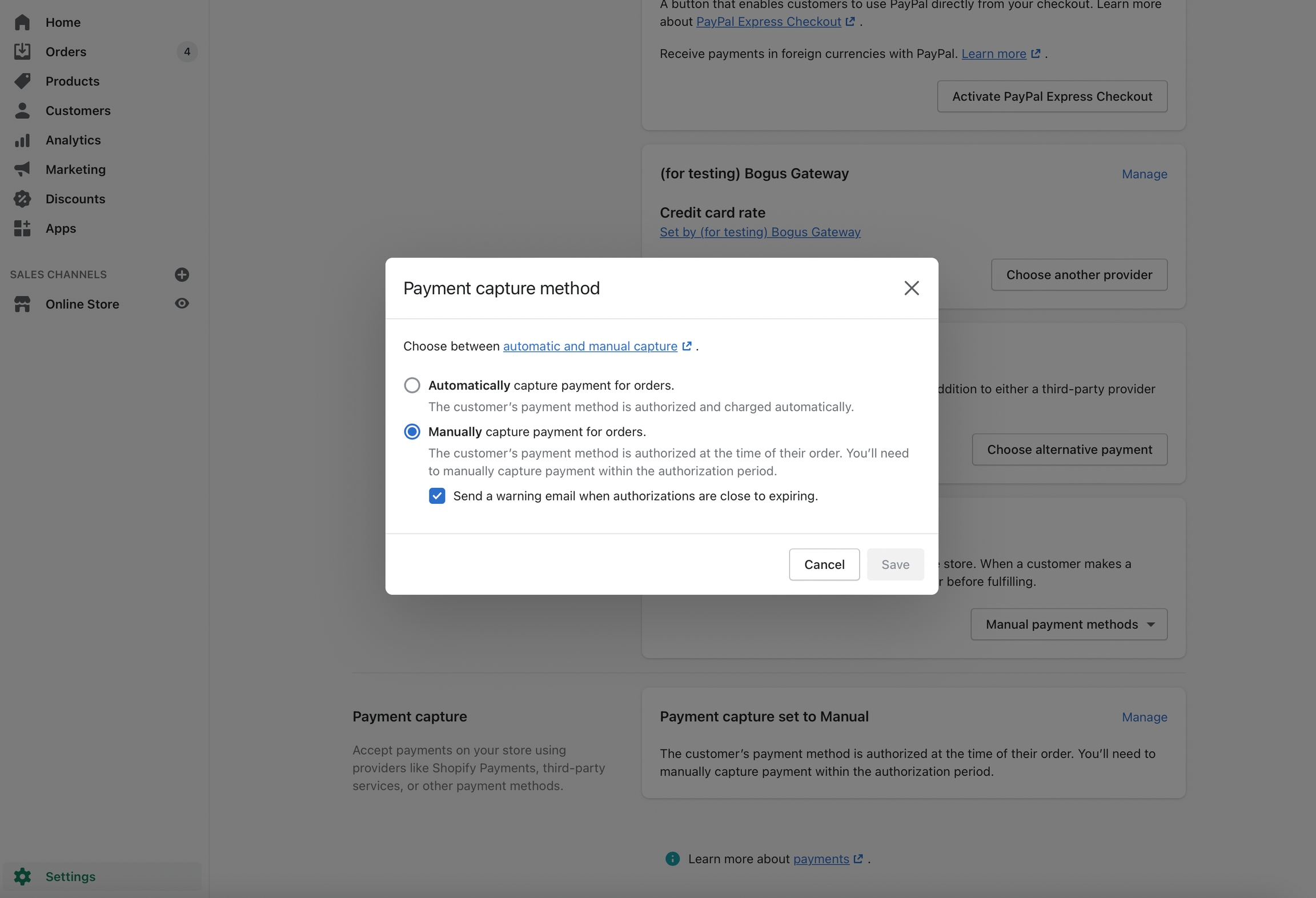 Scroll down to find the Payment capture section, choose to Manage for Payment capture set to Manual: