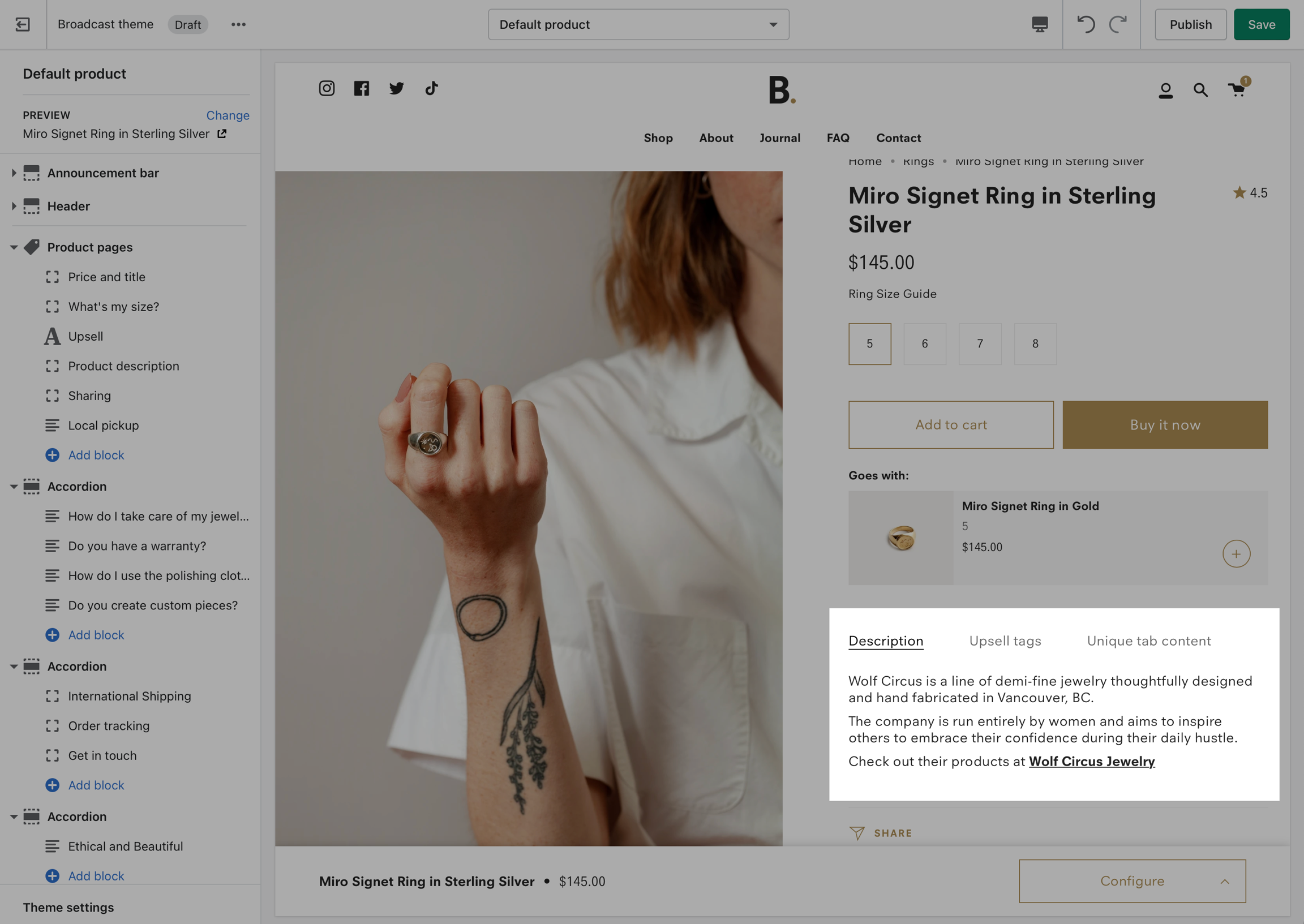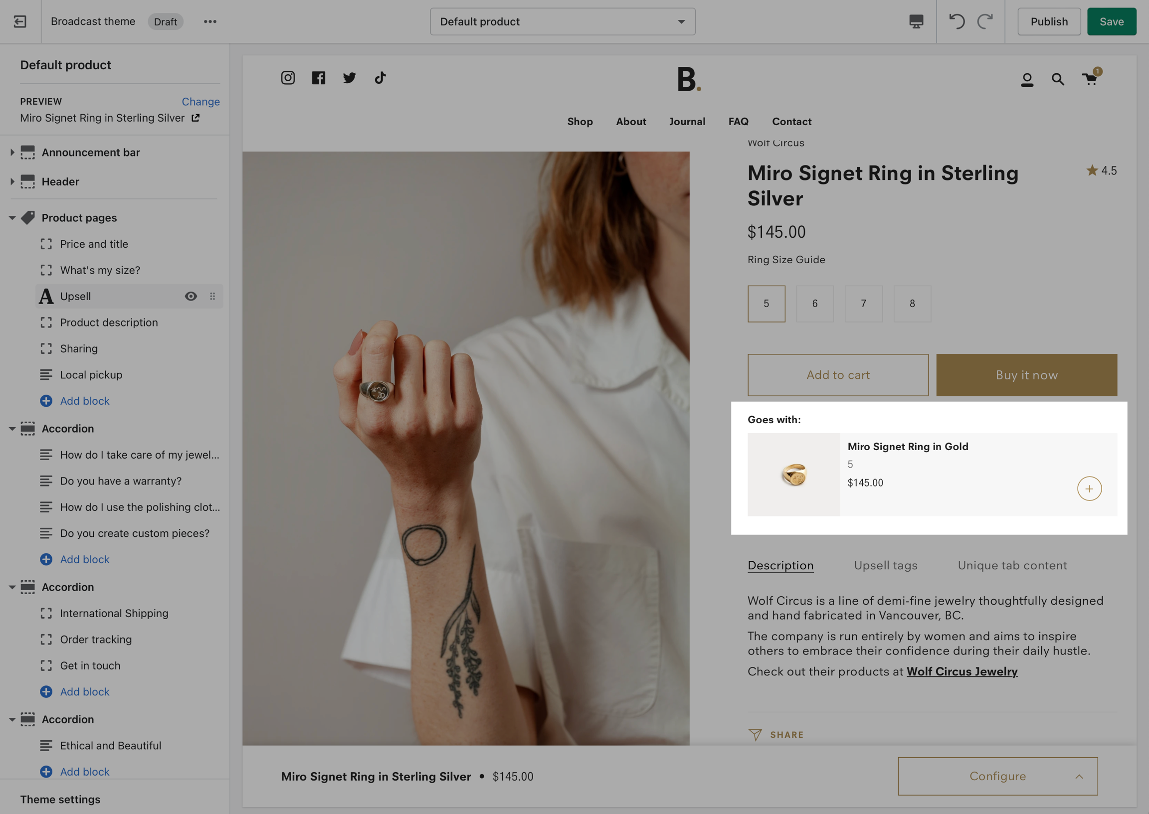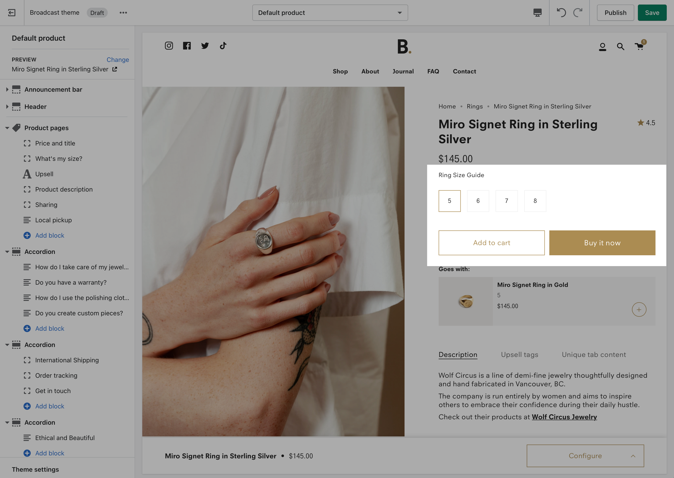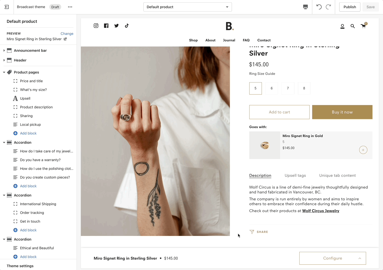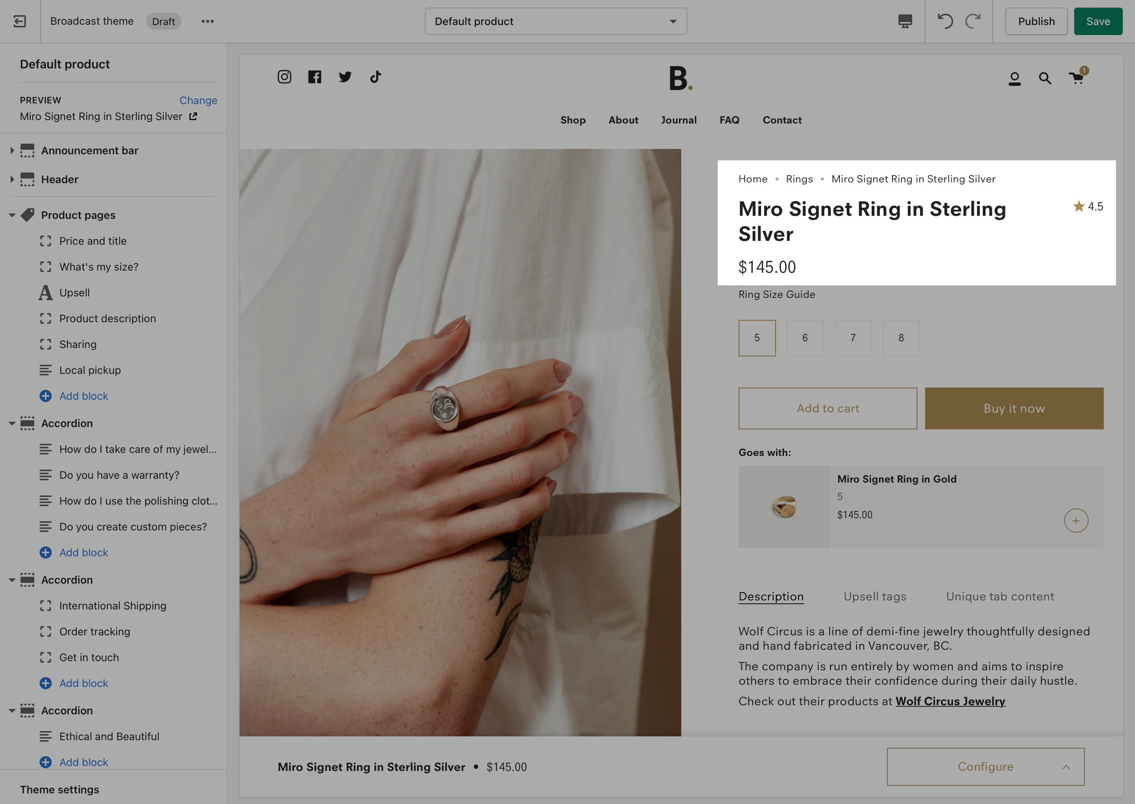 Broadcast Product page theme blocks help you customize the primary or core content for your product pages and product templates. Adding sections further enhances your merchandising.