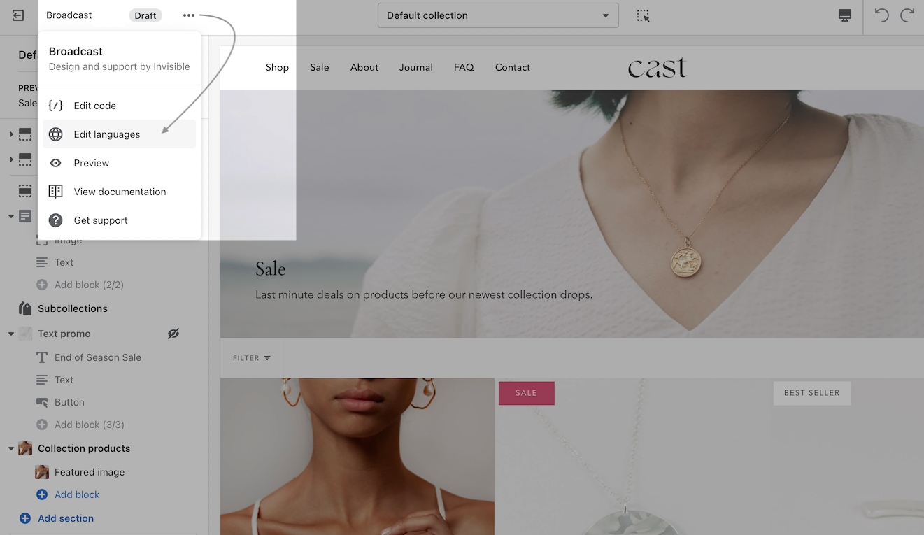 To modify the text "SALE" on Collection pages and Product Grid sections, the badge text value is found under Products, Product, On sale.