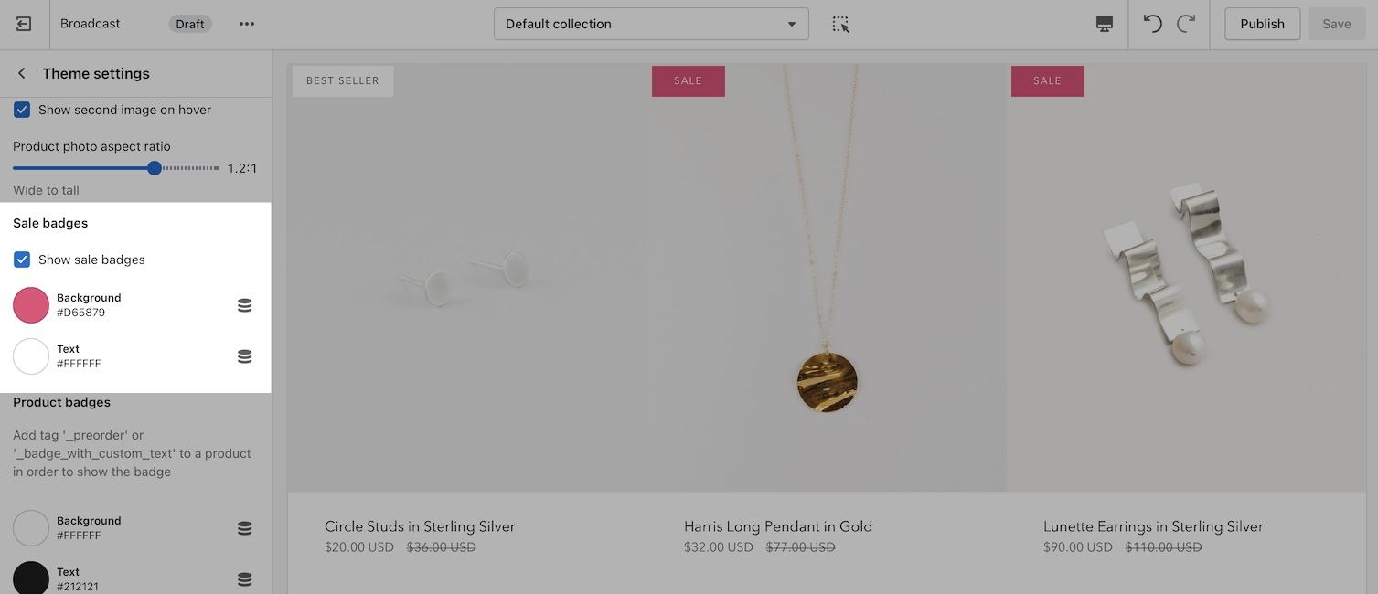 Use the Theme Editor to customize the Sale badge feature which is used on Collection pages and Product Grid sections.