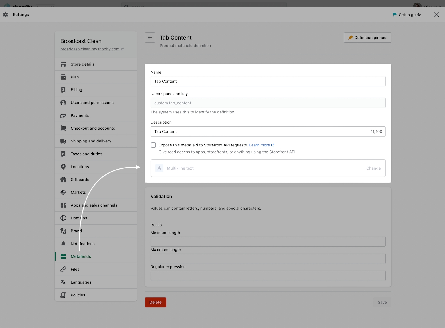 Create or define a Product metafield for your tab content using Multi-line text as the content type.