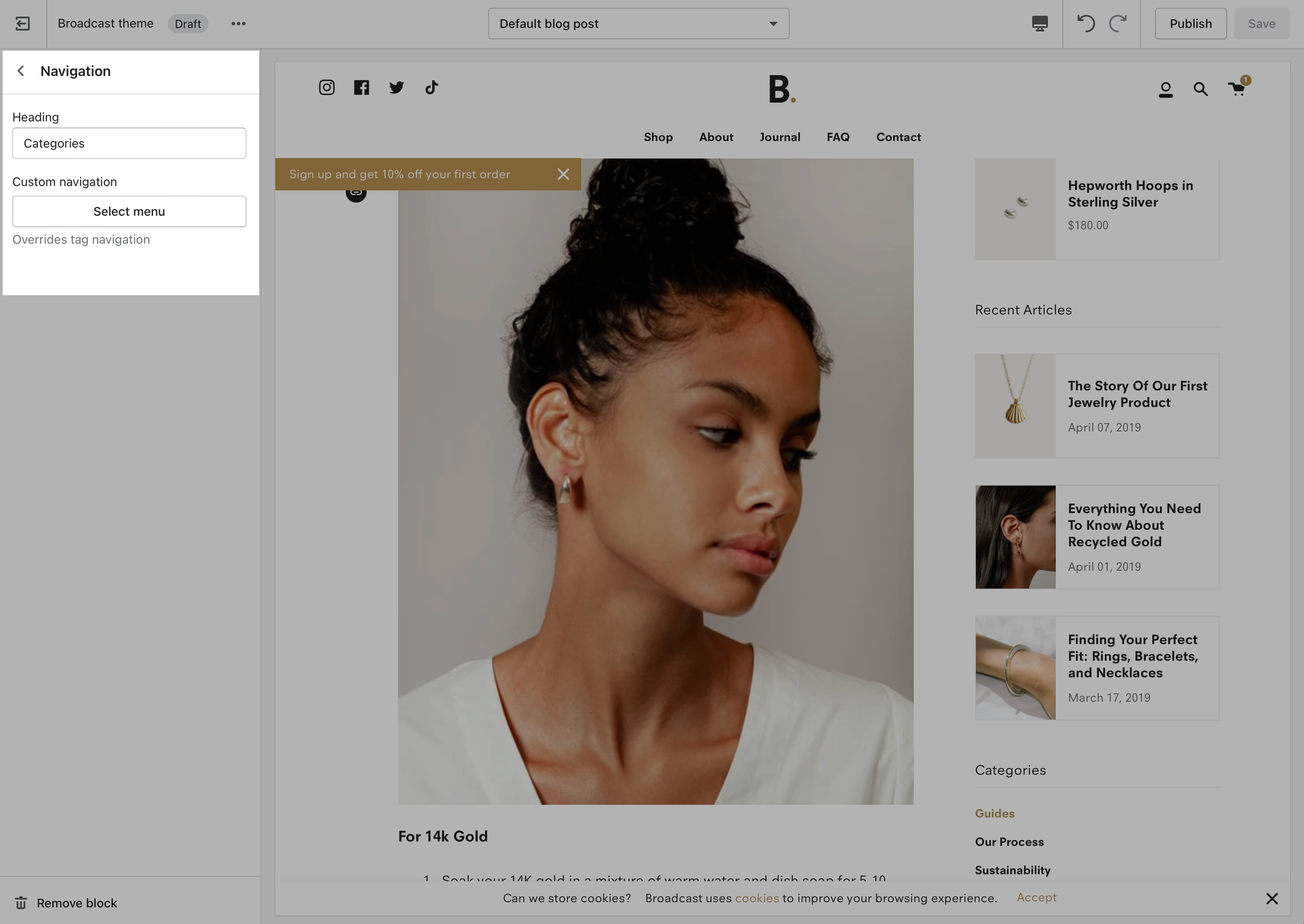 Add navigation links to the sidebar. By default, Broadcast will generate a menu from your blog post tags.