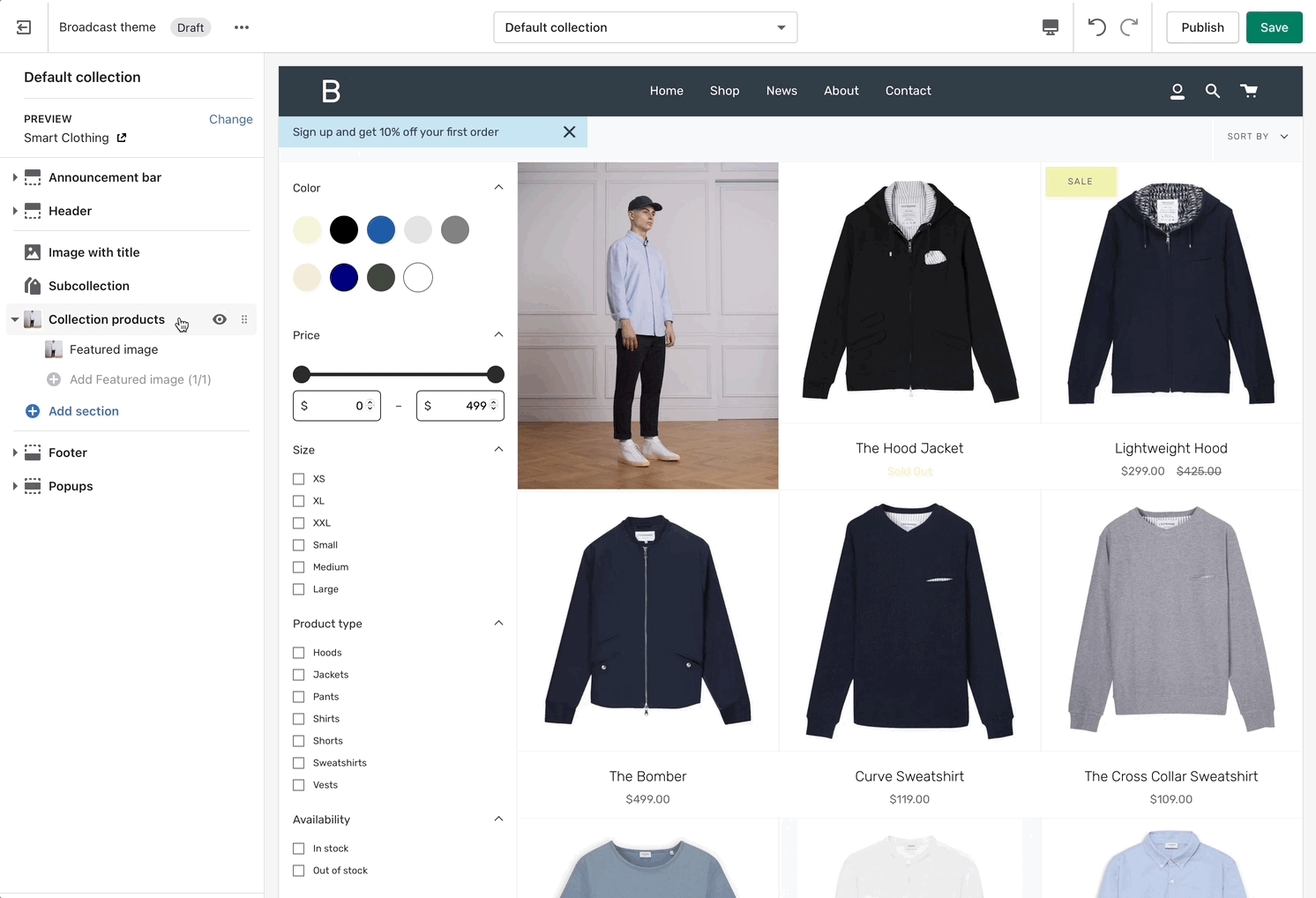 Setup with Broadcast is fast and simple. Using the Theme Editor, navigate to any collection page (or choose the default collection template) and click on Collection products to view the settings: