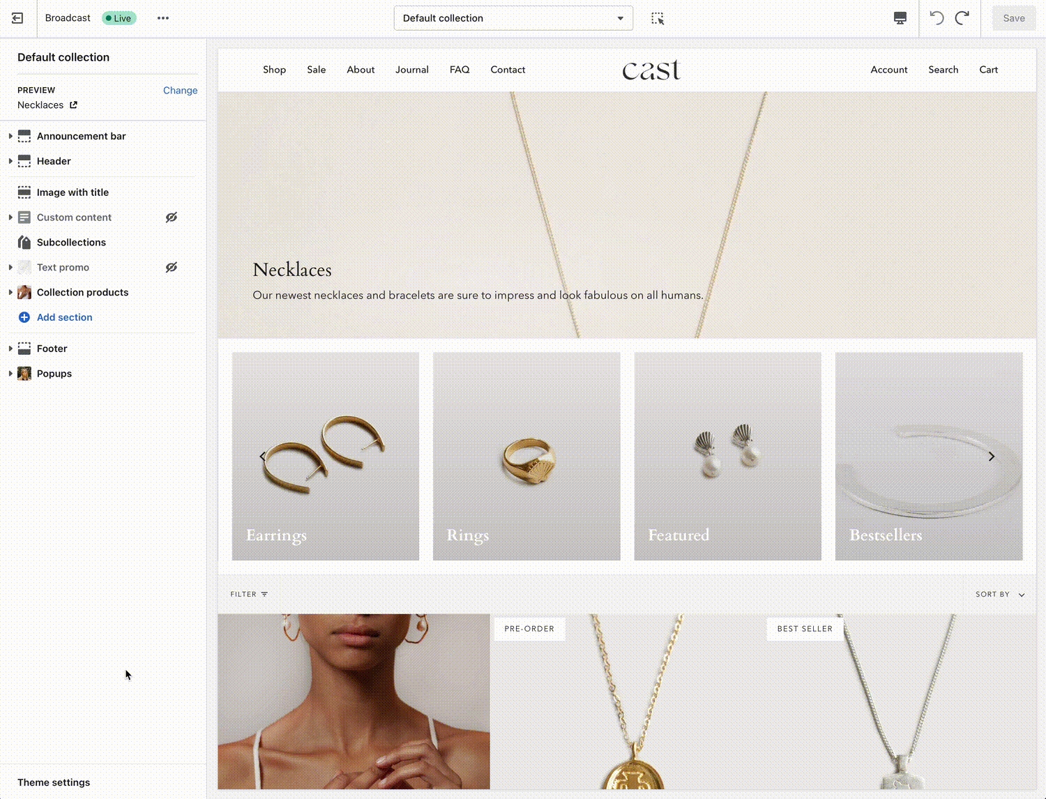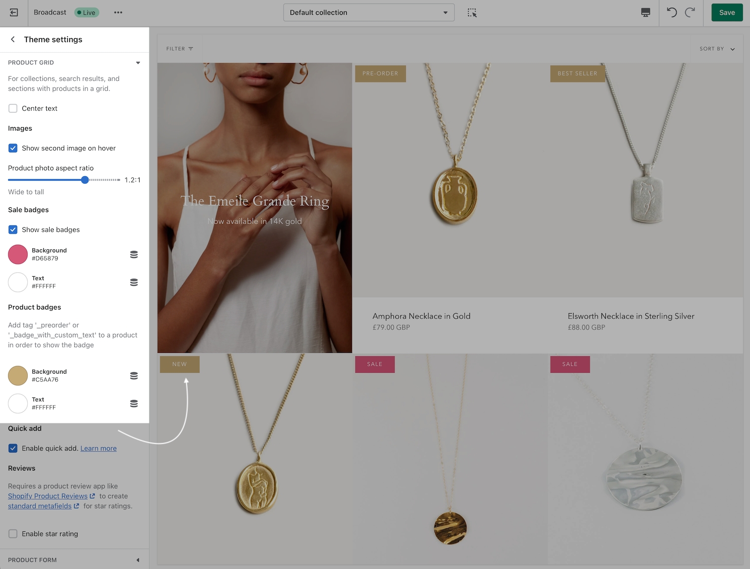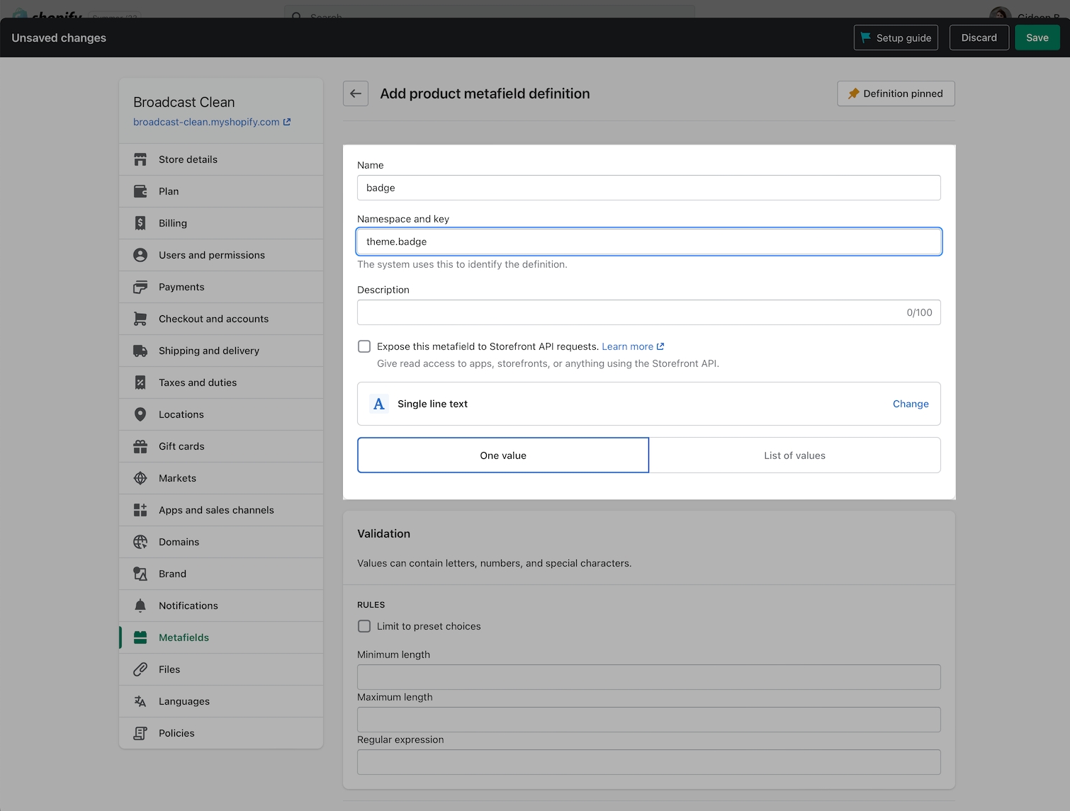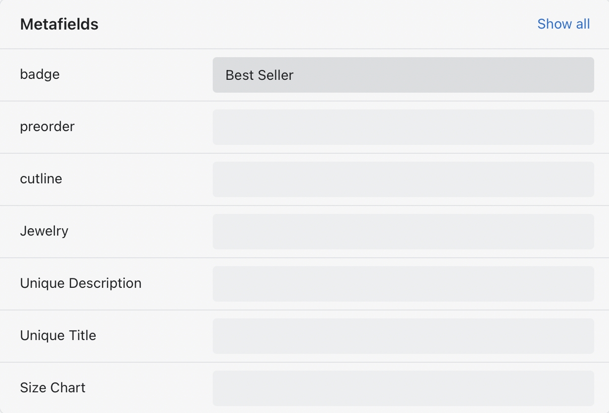 When utilizing metafields you simply create one metafield to activate the functionality. From there you can add badge text to any of your products and Broadcast will automatically generate a custom badge for that product on collection pages or any section using a product grid.