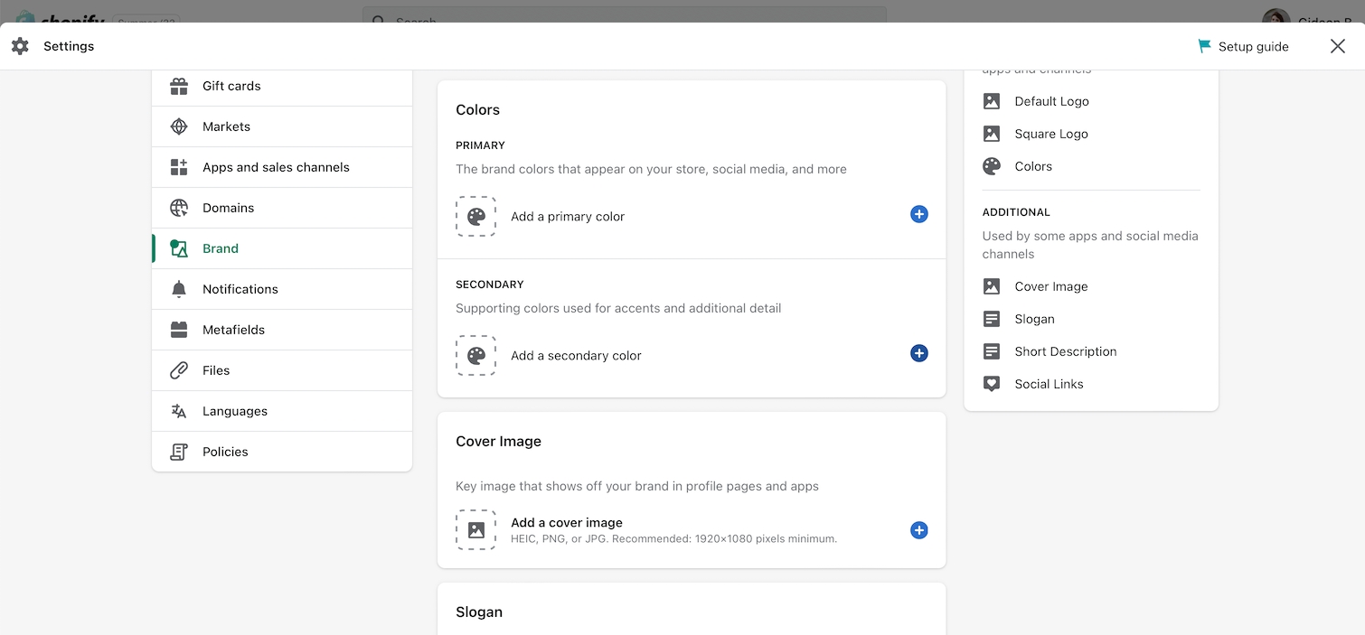 Brand colors are configured and managed in the Shopify Admin -> Settings -> Brand: