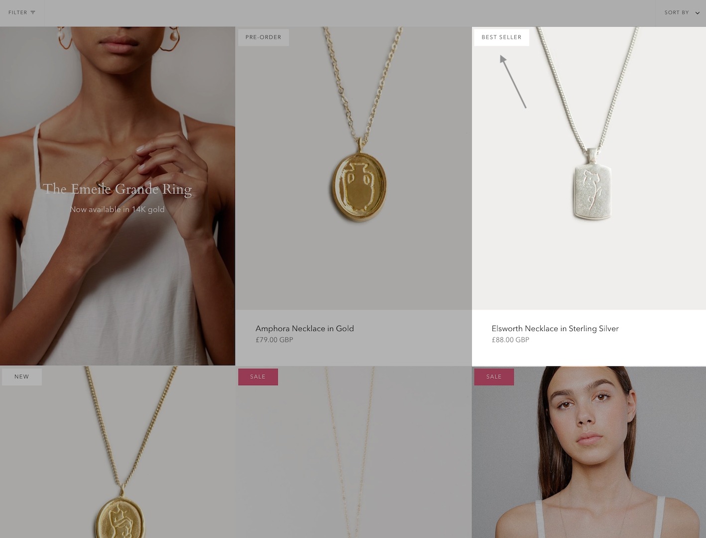 When viewing a collection page or section with a product grid-style list, the custom badge is added to the top left corner if the product exists in that listing: