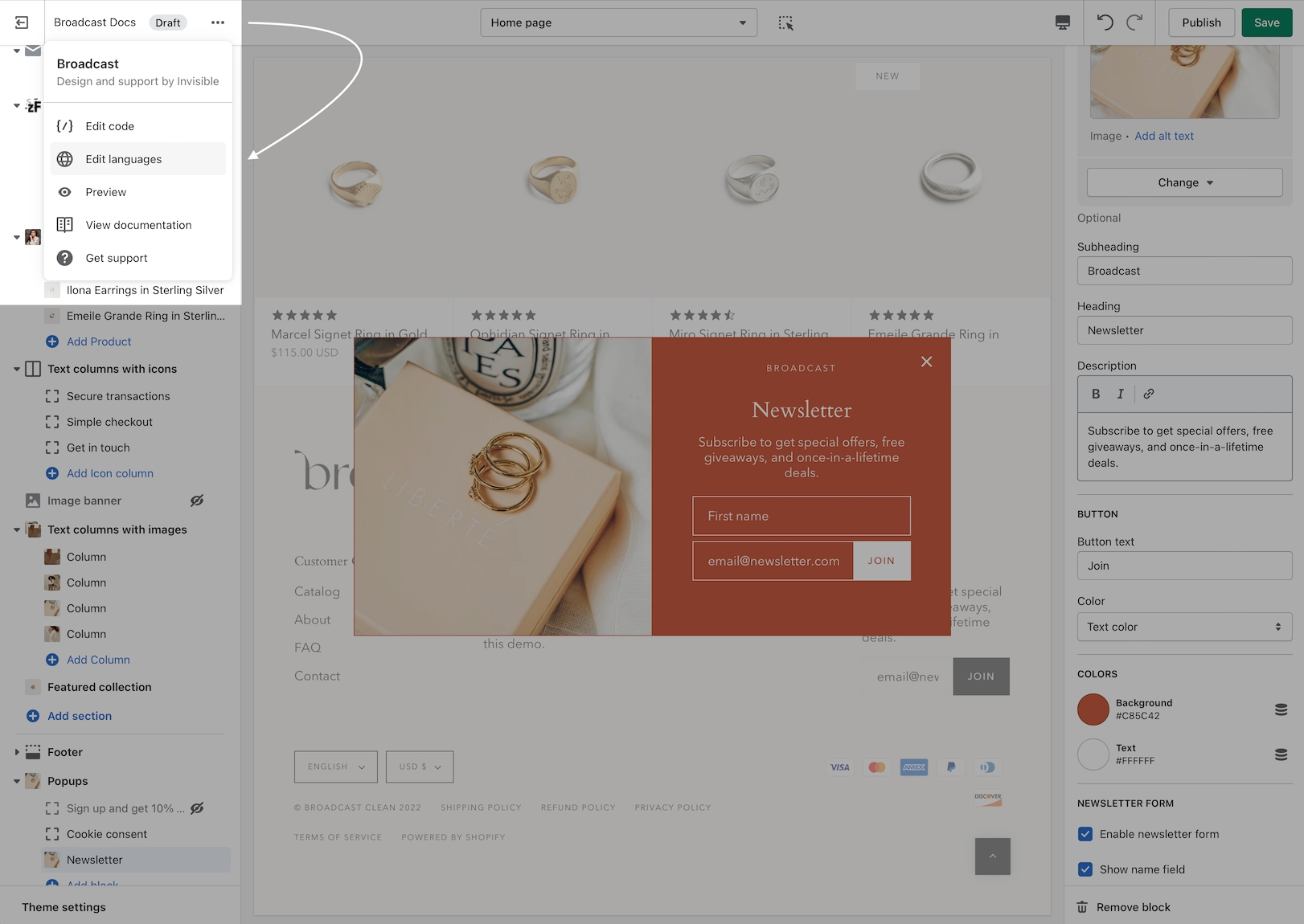 To configure the success message and include the Coupon Code, use the Language editor (Edit languages).