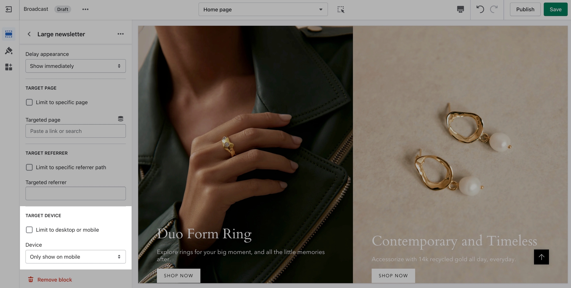 Create a custom popup for mobile devices and another popup for desktop browsers with Target Device. Each popup can be customized with different assets and messaging.