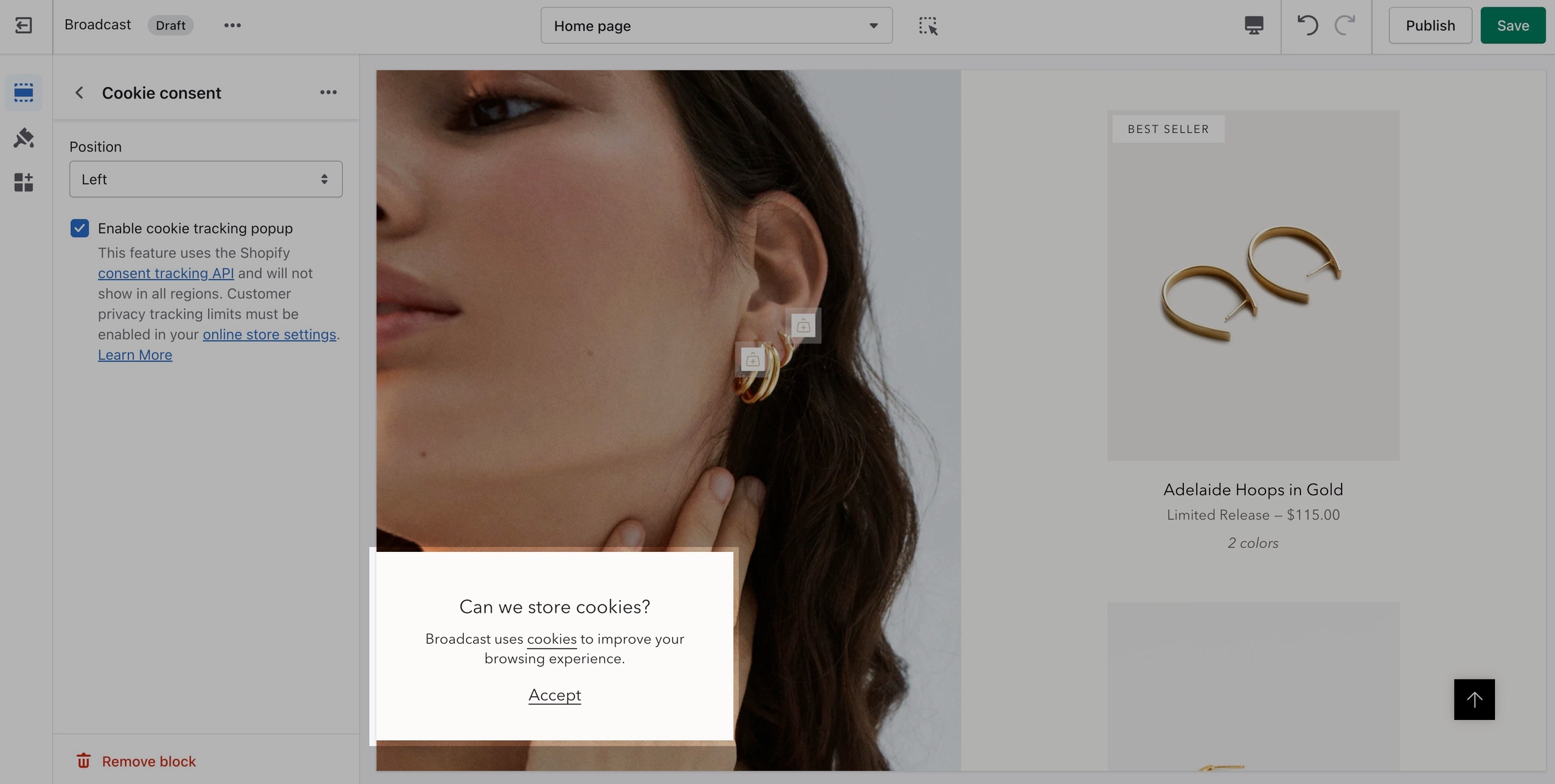 Broadcast includes a Cookies consent popup which allows you to display a message an accept button and a link to your Privacy Policy page: