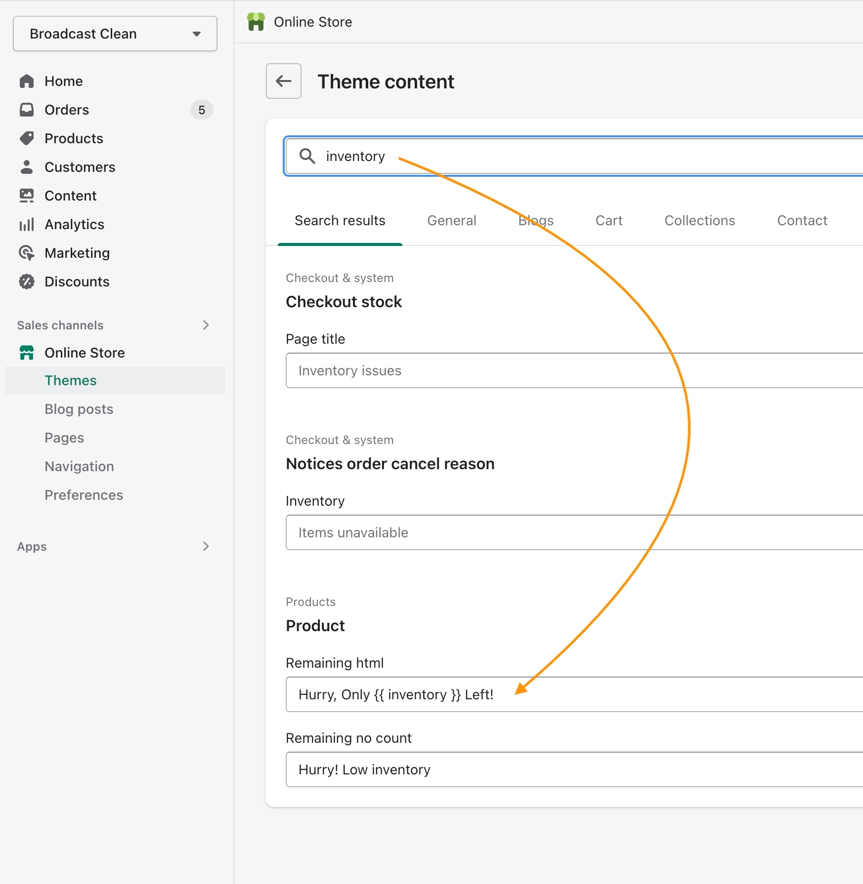 Theme content allows you to customize the text for various components within the theme. In the search box at the top, type in "inventory", then at the bottom you'll find two fields that can be customized in your current language: