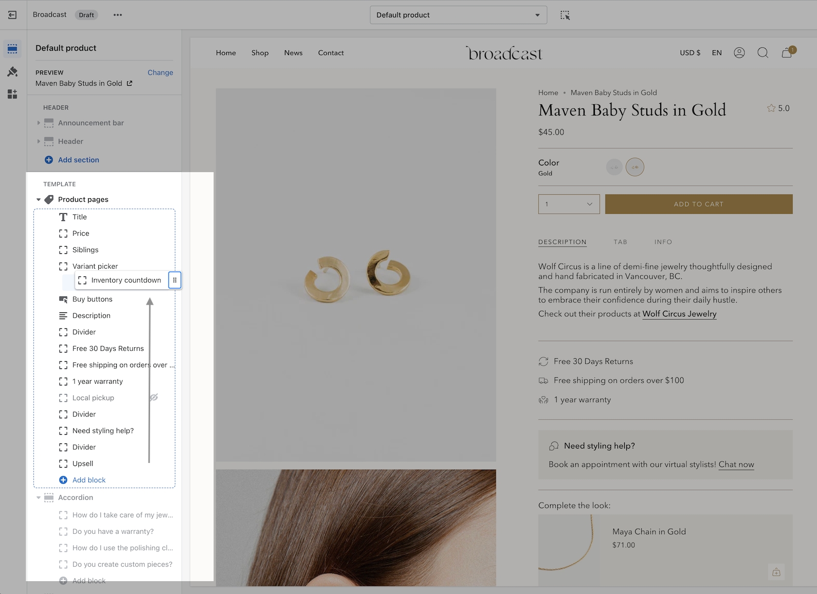 In the next step, we'll use the Theme Editor and add the Inventory countdown block to the Product form: