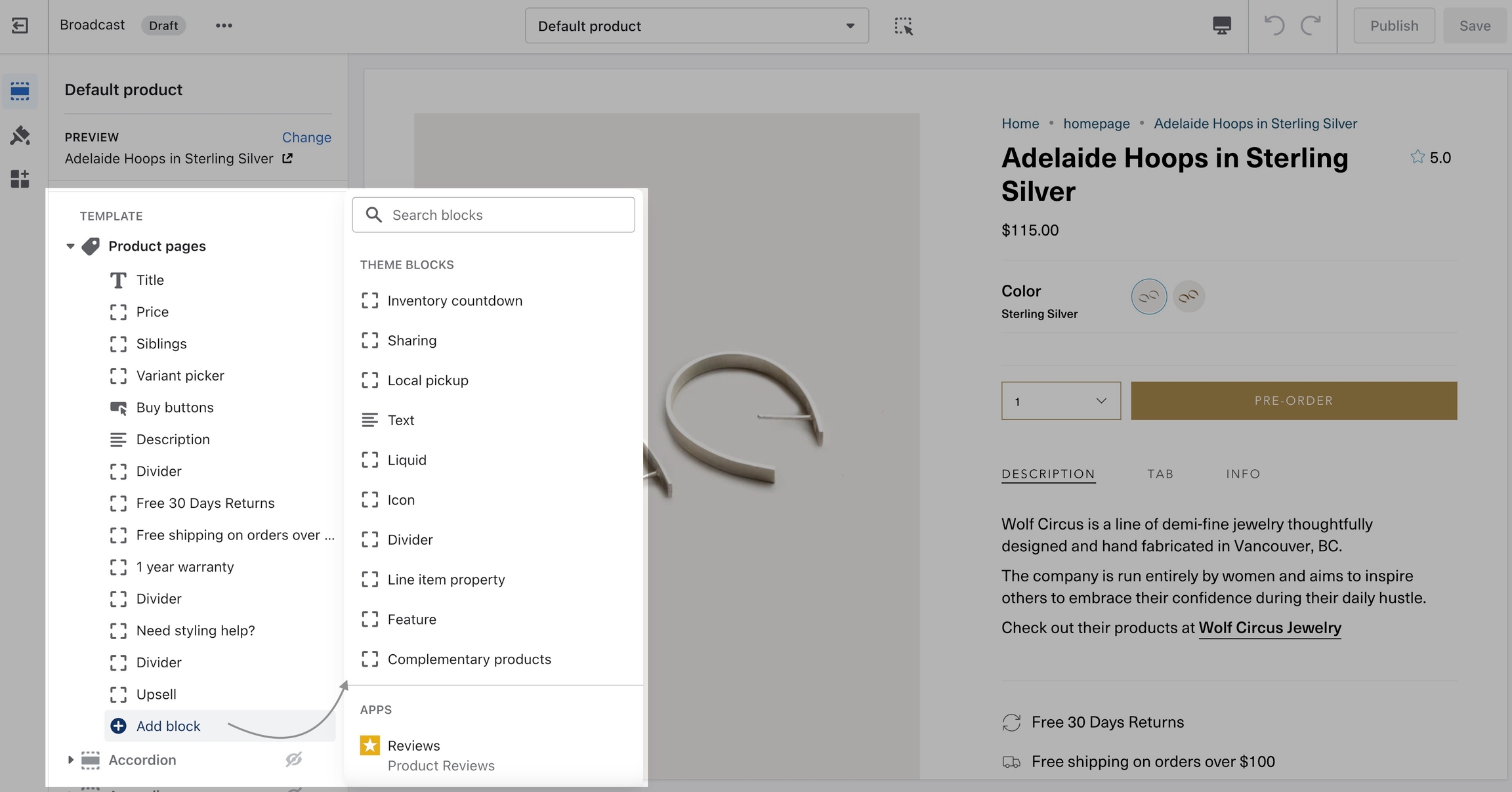 Broadcast Product page theme blocks help you customize the primary or core content for your product pages and product templates.