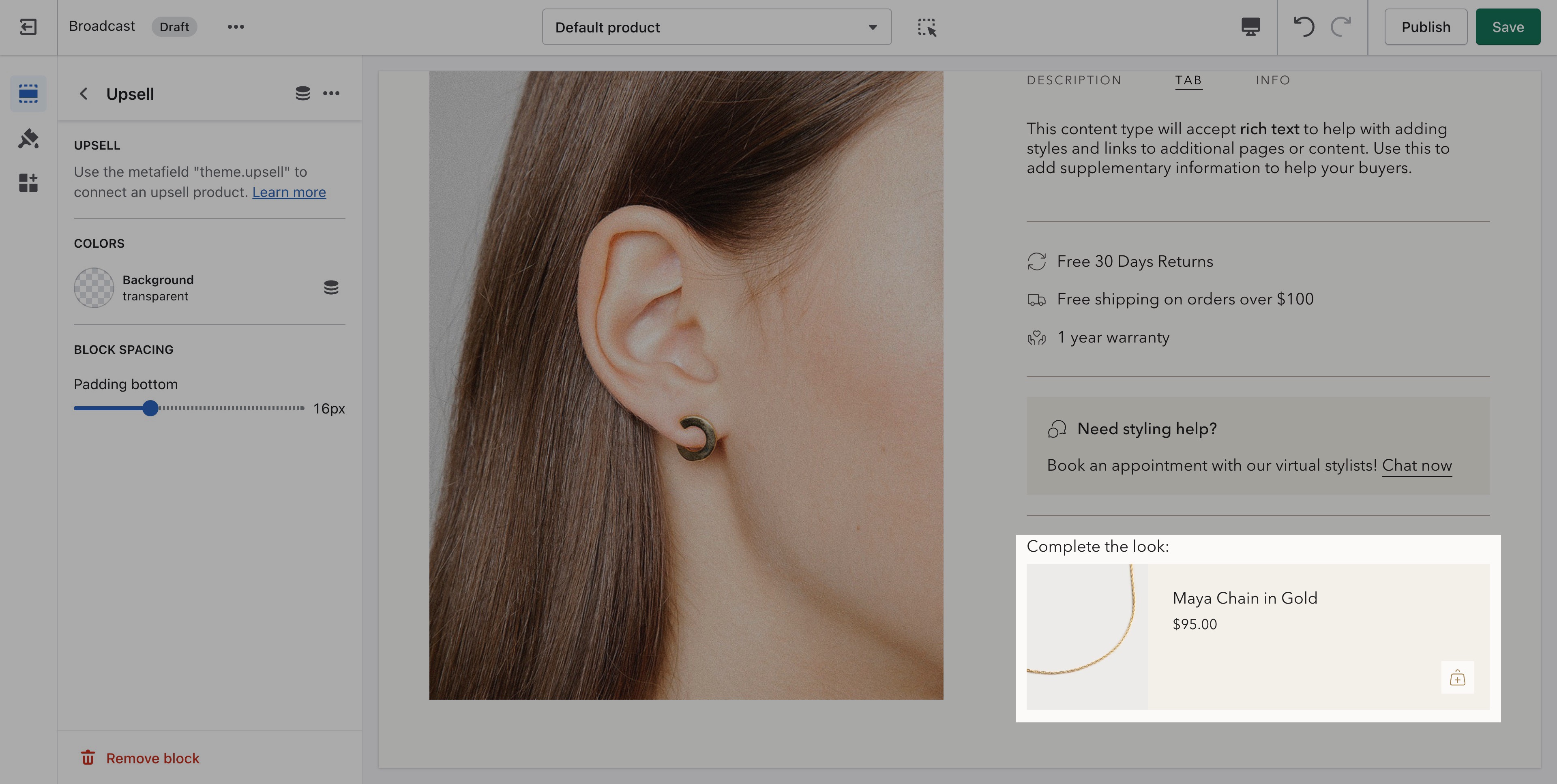 No customizable settings. Tags are required in Product setup to display paired products or specific paired product variants. [See the article to learn how](https://broadcast.presidiocreative.com/broadcast-v4/upsell/upselling-with-tags).