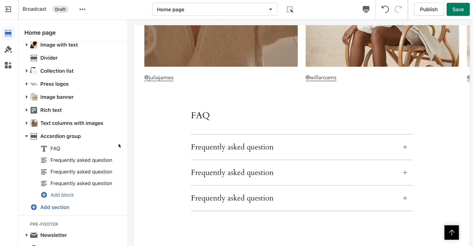 Similar to 'Accordion', you can use 'Accordion group' to add tabs with information.