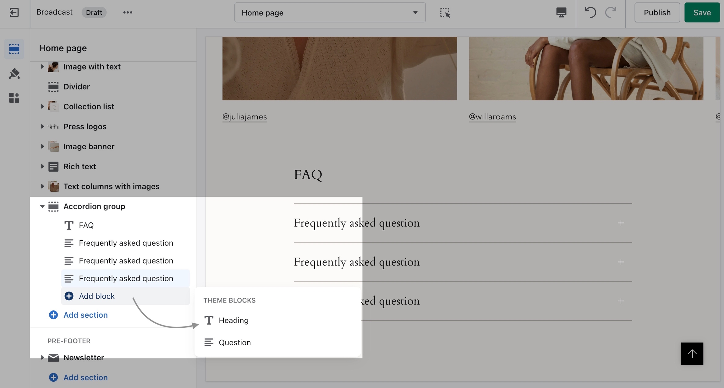 Use a 'Heading' block to separate groups. Add a 'Question' block to add a new text block under the same group.
