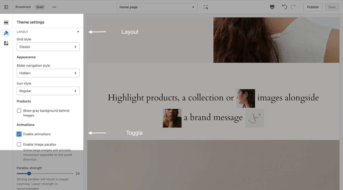 Images will animate into this section to give a lively look when the customer reaches the section. To disable the animations, use the toggle found under the Layout section of Theme Settings: