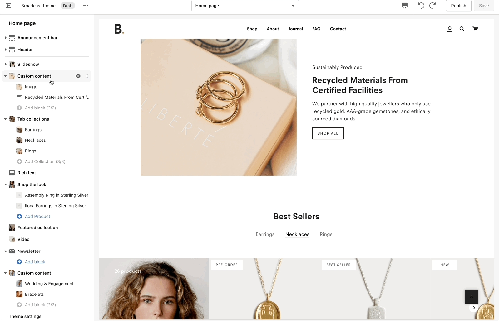 Build rich and creative sections on your homepage, product pages, collections, blogs, pages, and more by exploring different sections and block types.