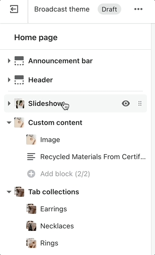 An example of a content block is a slide in a slideshow section. You can configure each slide, hide a slide, reorder slides, and remove or delete a slide.