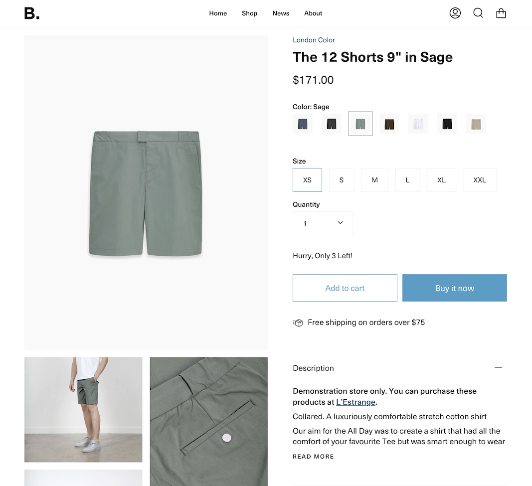 Clicking on a swatch displays only the images associated with that variant option and also the product details and prices for the variant: