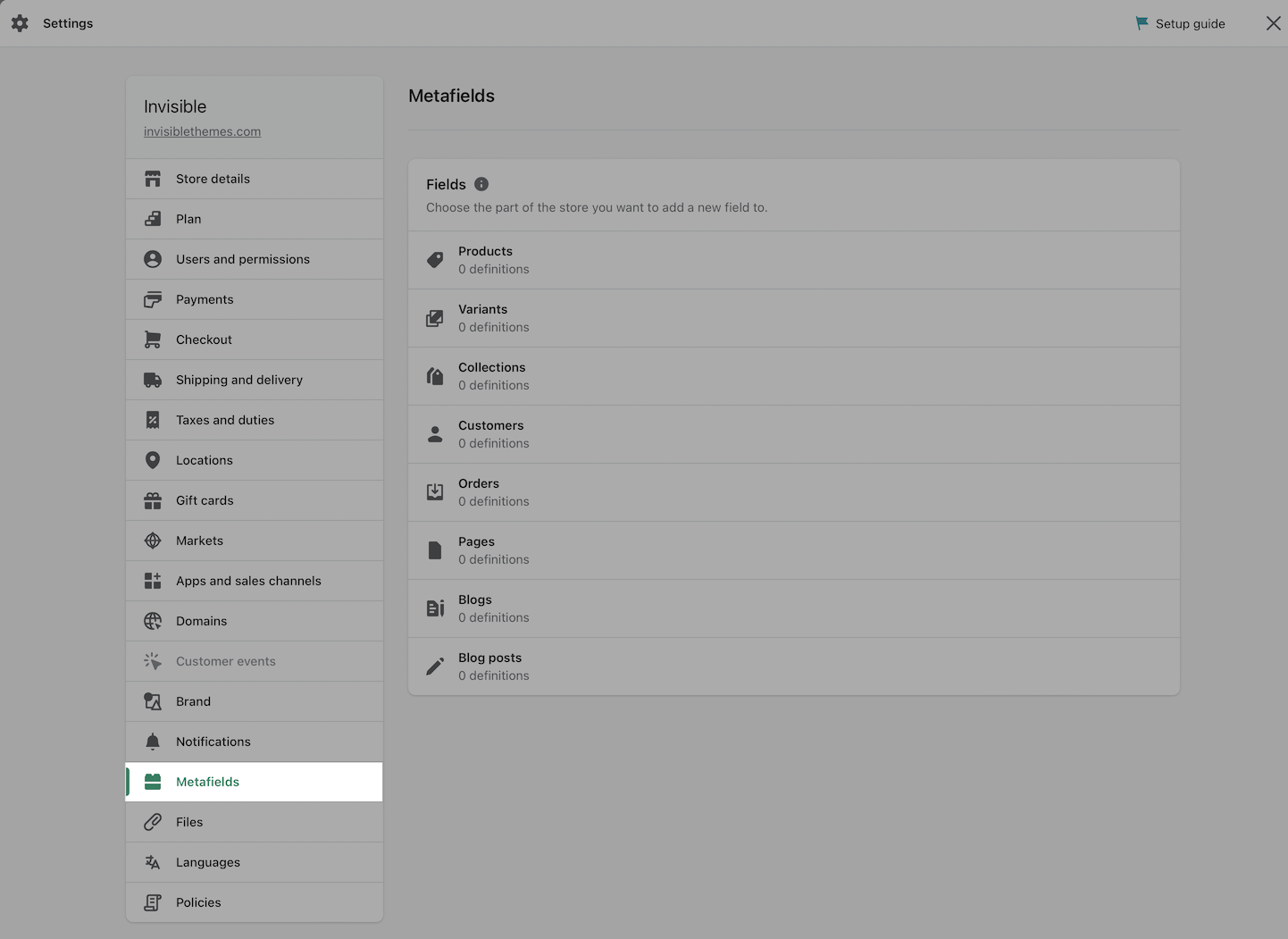 Use the metafields editor under **Settings** in the Shopify Admin: