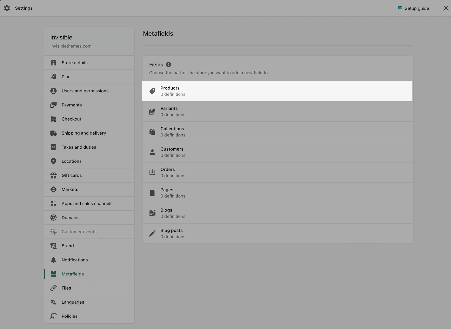 Both metafields will be defined under the category of Products: