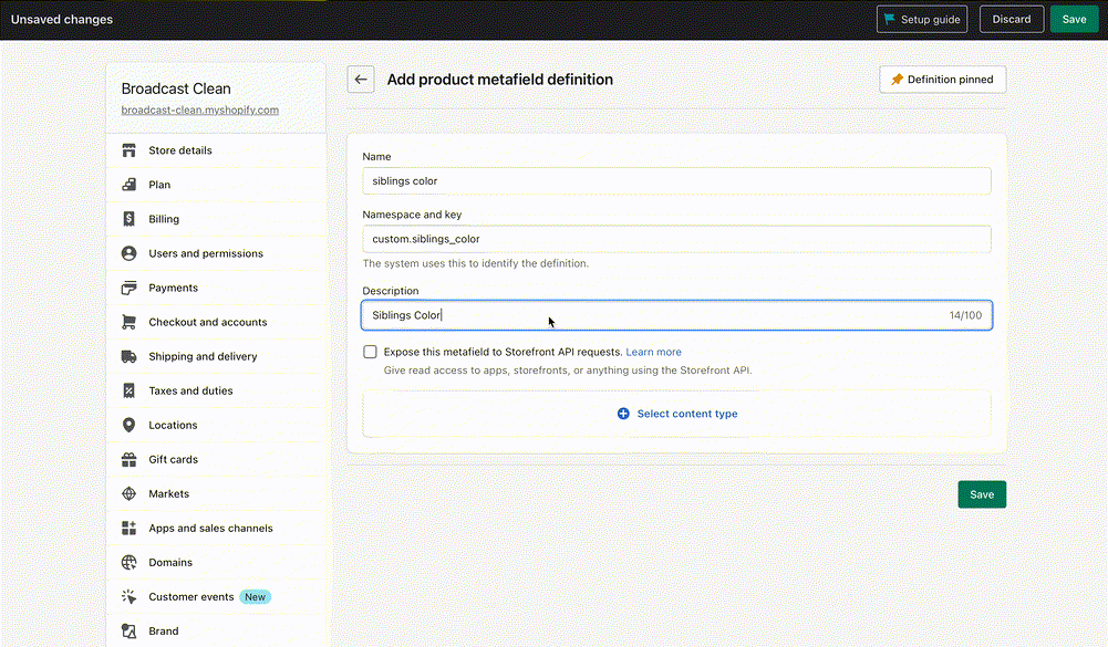 Start by defining a Products metafield and name it Sibling Color. Then change the Namespace from custom to theme: