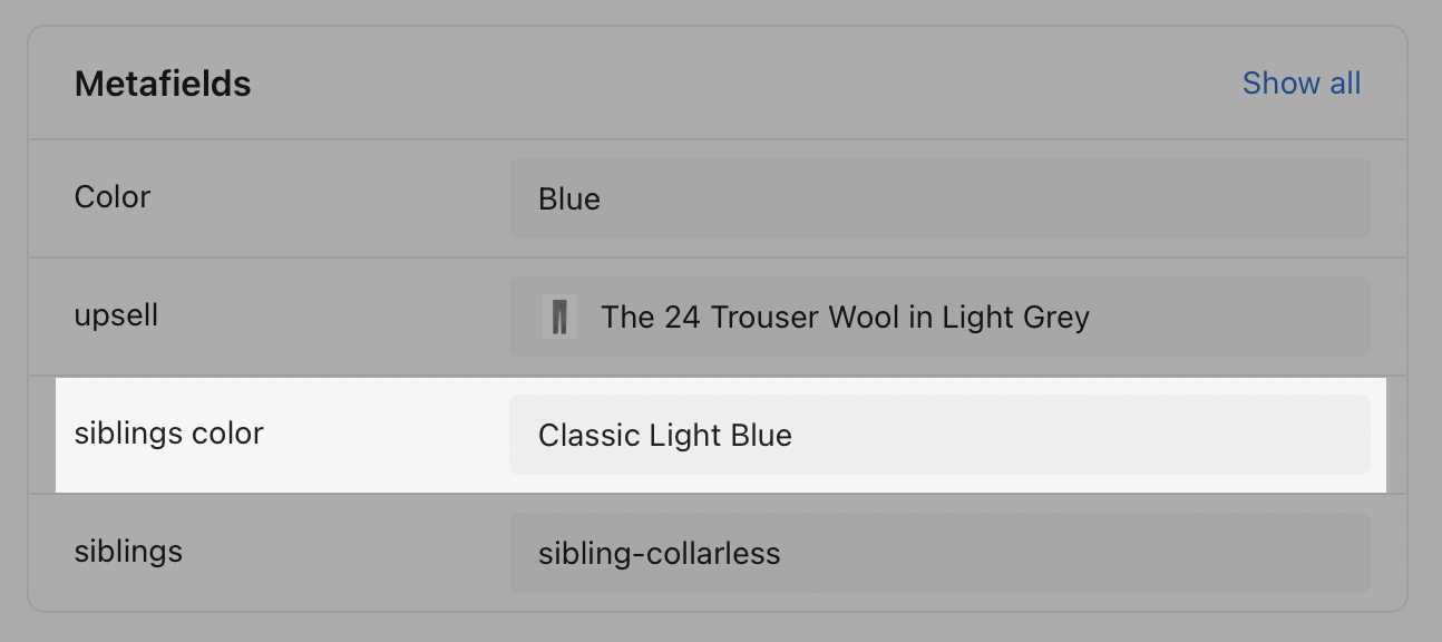 For example, each product sibling for the product "The All Day Shirt" belongs to a collection with the handle of sibling-collarless