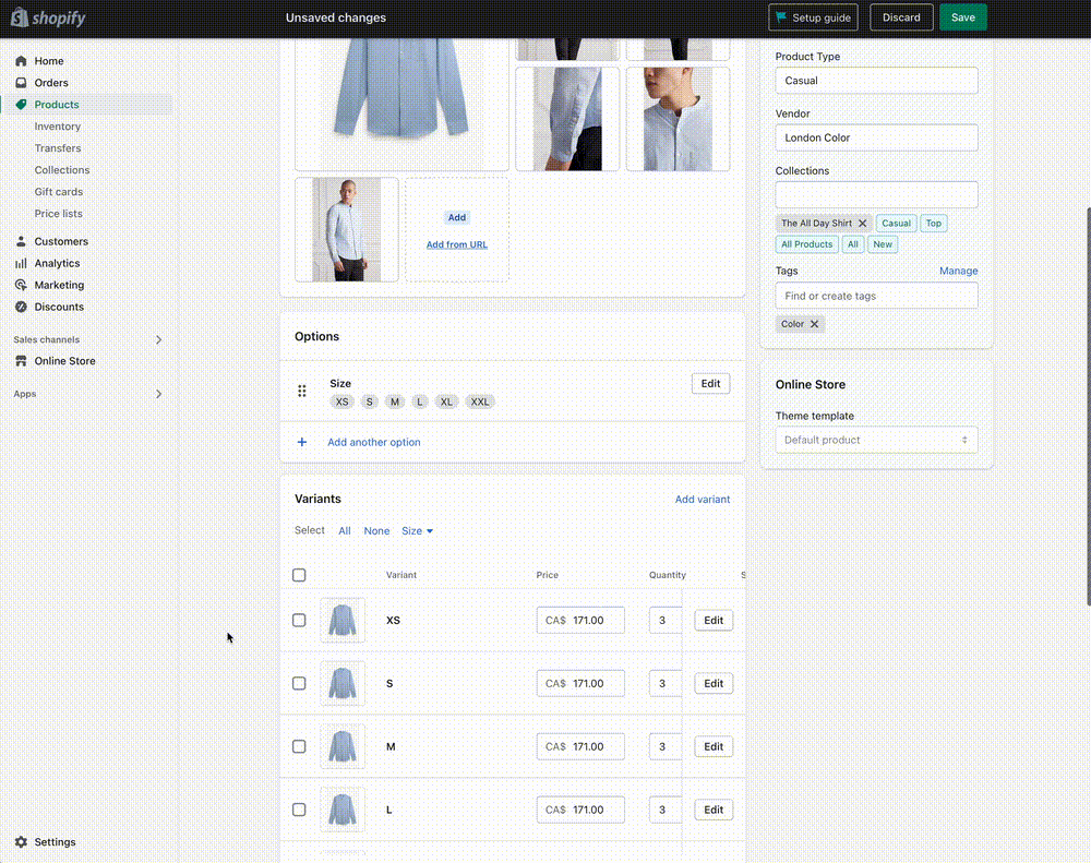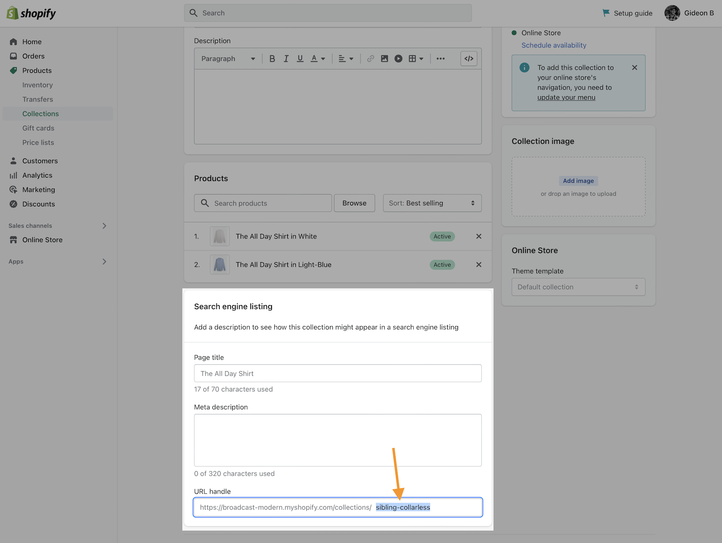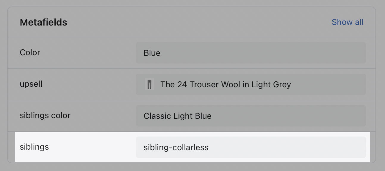 For example, each product sibling for the product "The All Day Shirt" belongs to a collection with the handle of `sibling-collarless`: