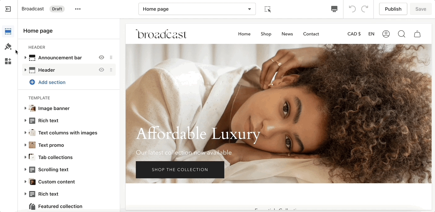'Theme Settings' is set off to the left side in the Theme Editor. This menu contains a bundle of all global settings in Broadcast.
