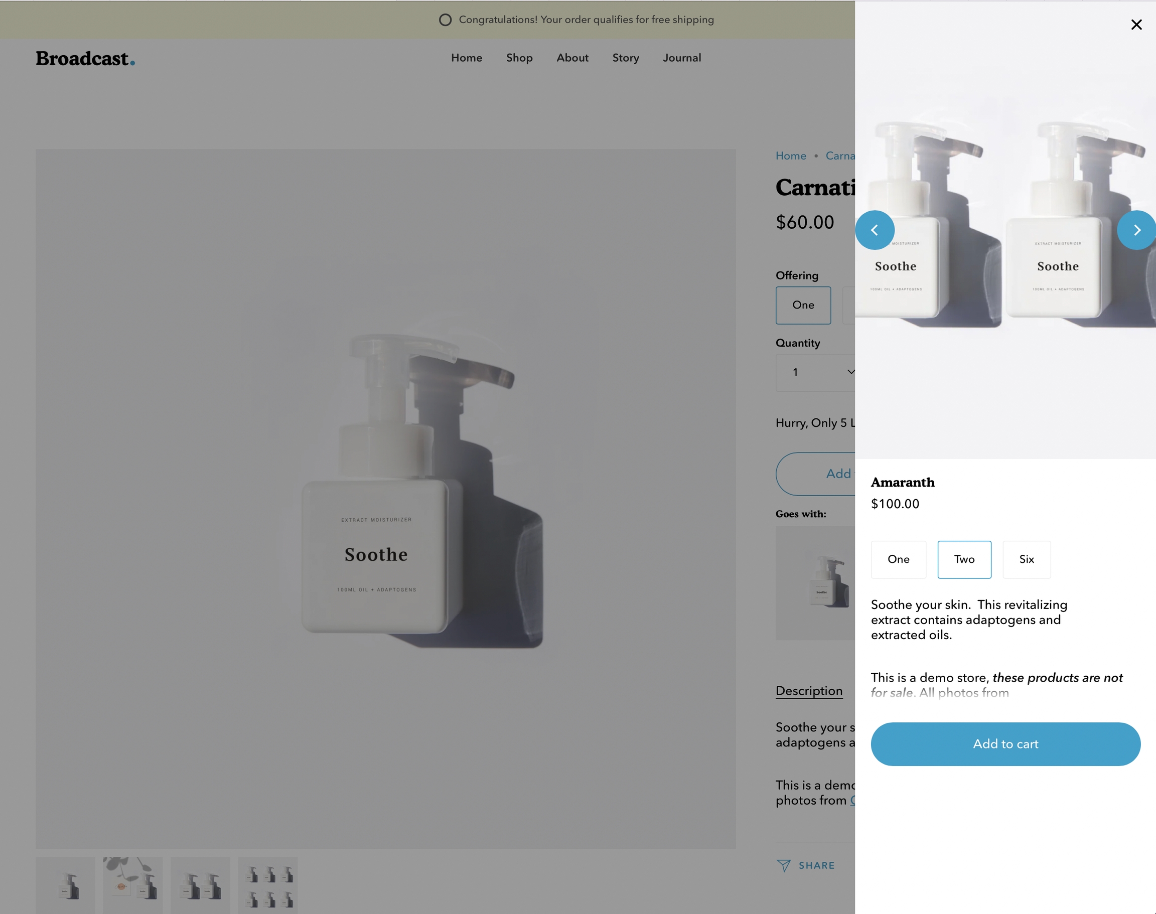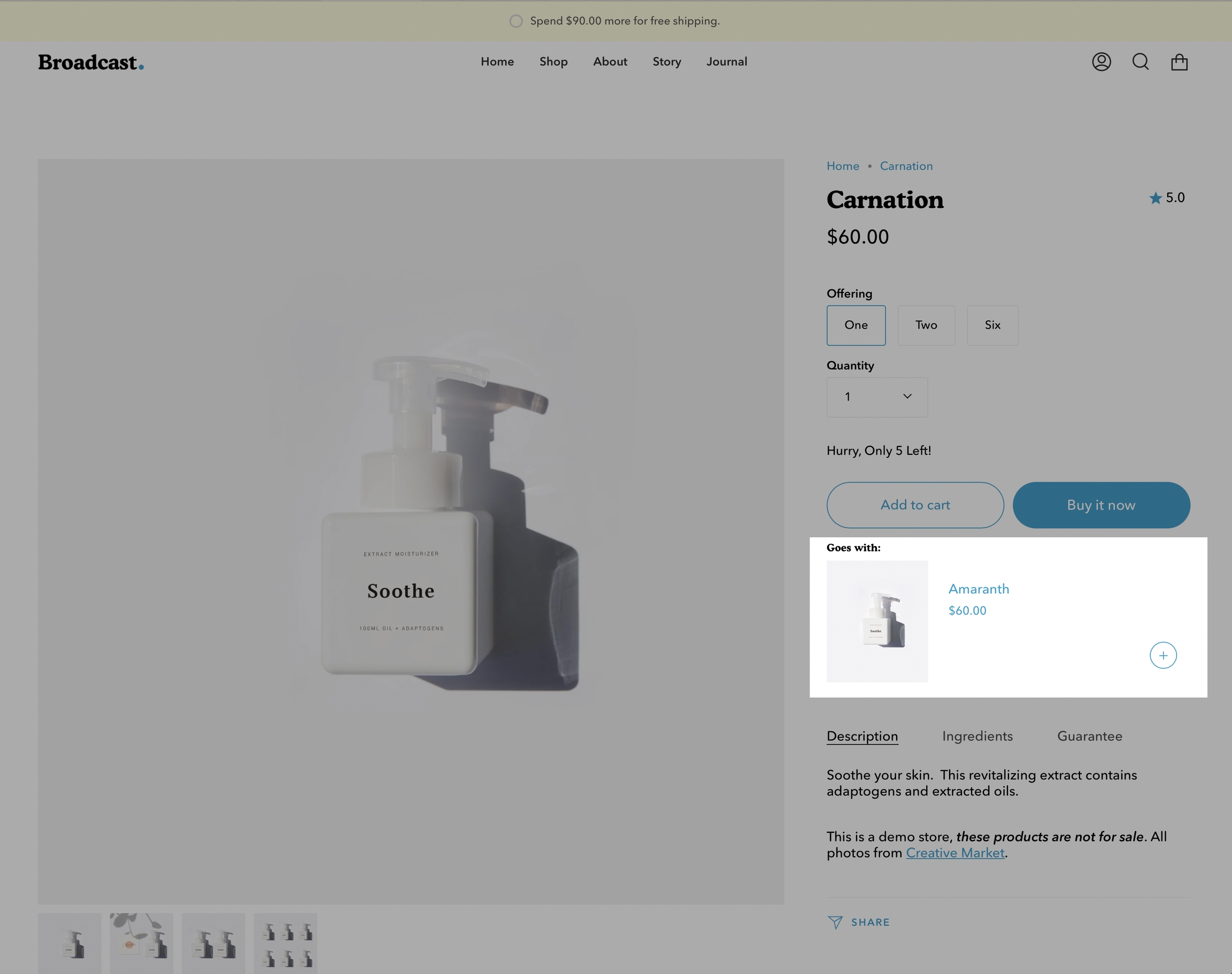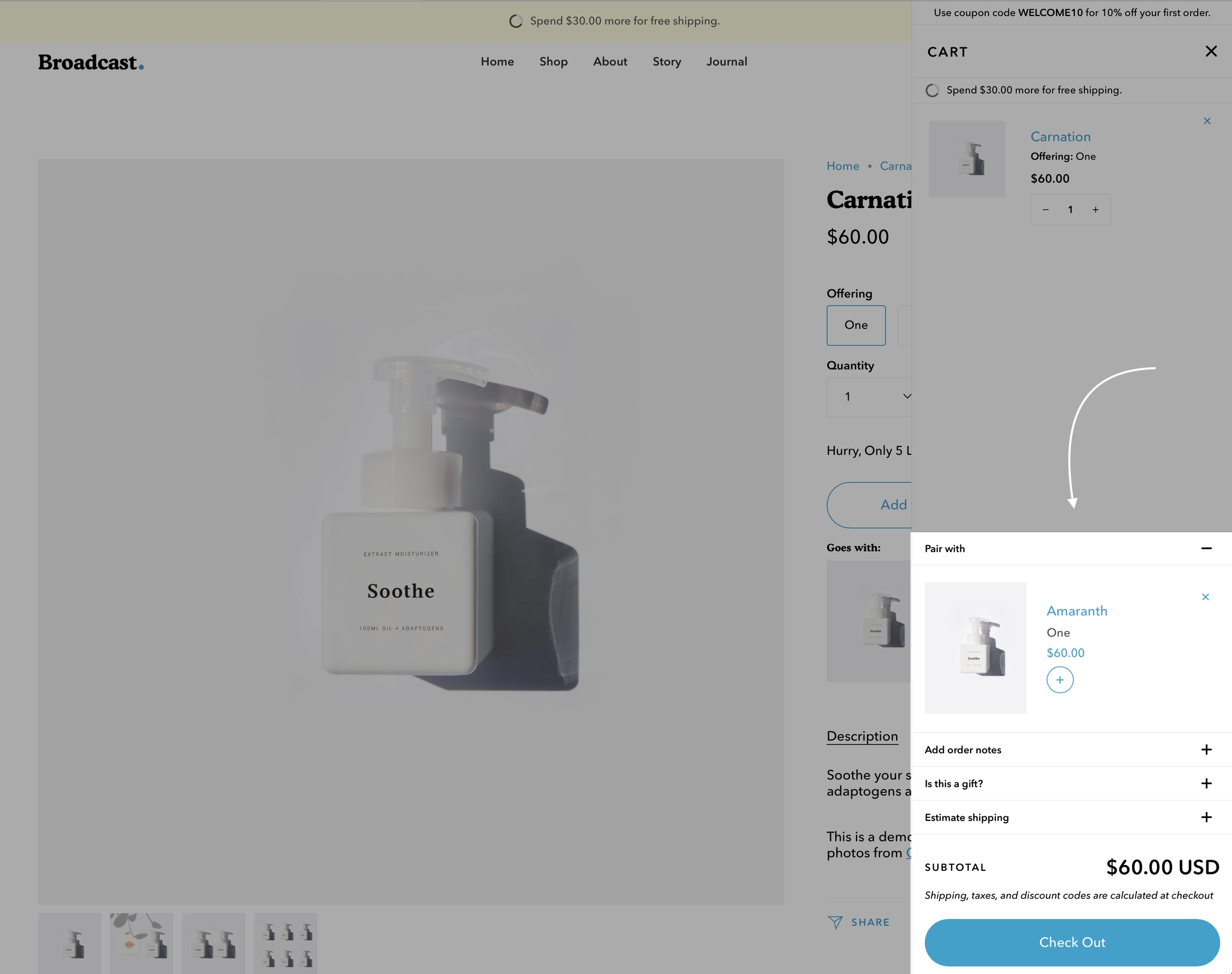 With Broadcast, you can suggest a pairing product on any of your Product pages. This allows the customer to purchase two separate products within one product page.