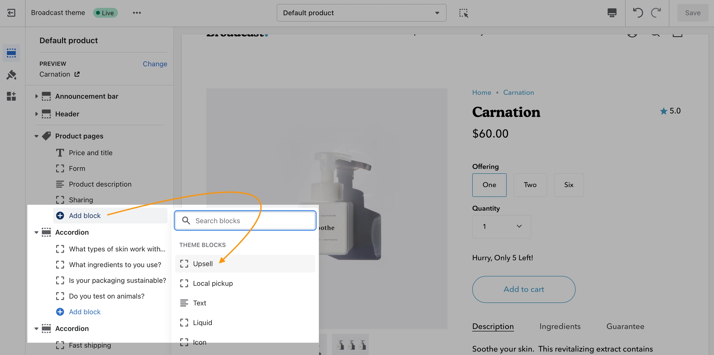 Add the Upsell block to the Product form in the Theme Editor.