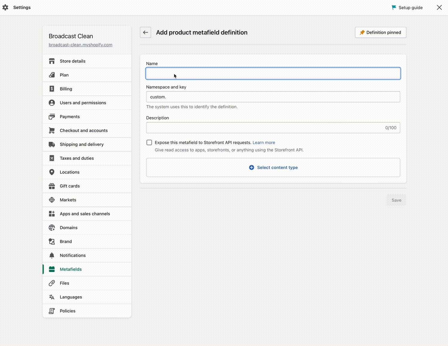 Let's begin with creating a new custom metafield:
