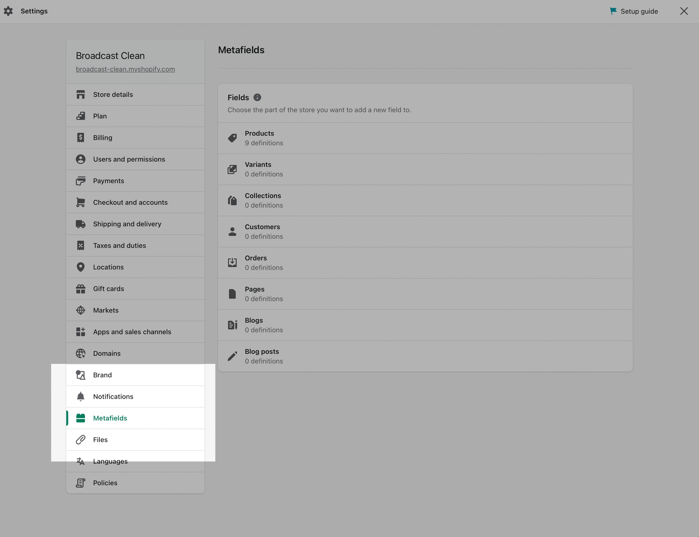 Start by defining a new metafield in your Shopify Admin under Settings: