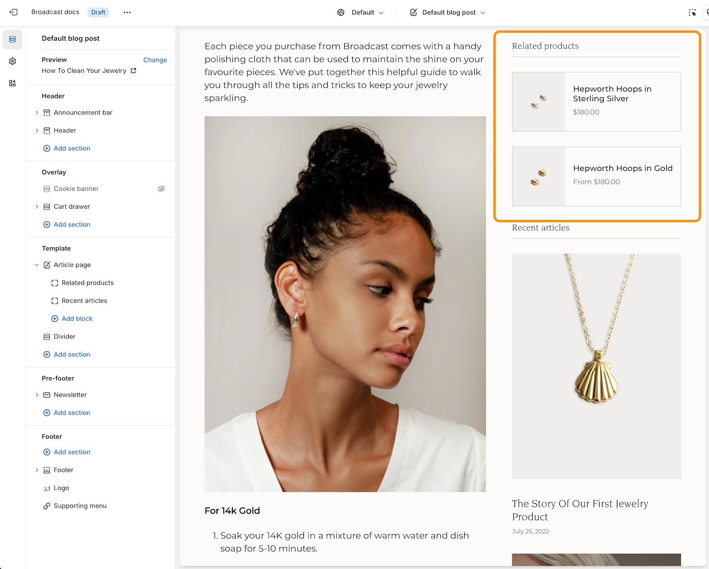 Add one or more product links directly into the article on any of your blog posts (Shopify Blog posts). Broadcast will then generate the "Related products" sidebar promotions from these links.