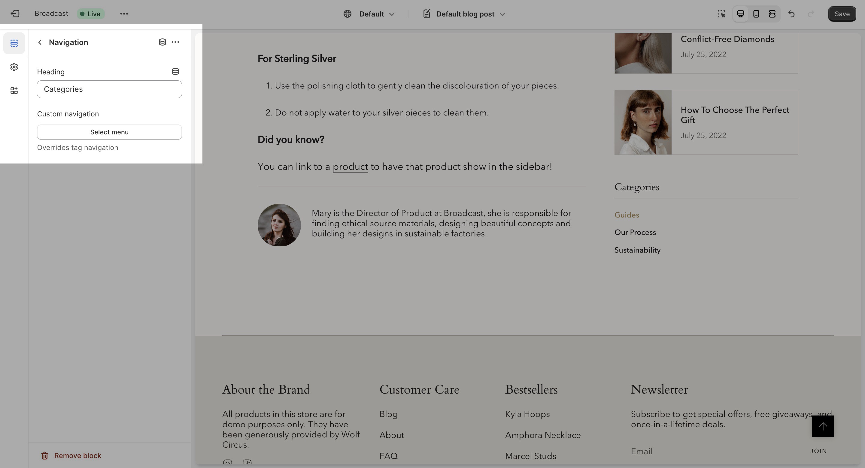 Add navigation links to the sidebar. By default, Broadcast will generate a menu from your blog post tags.